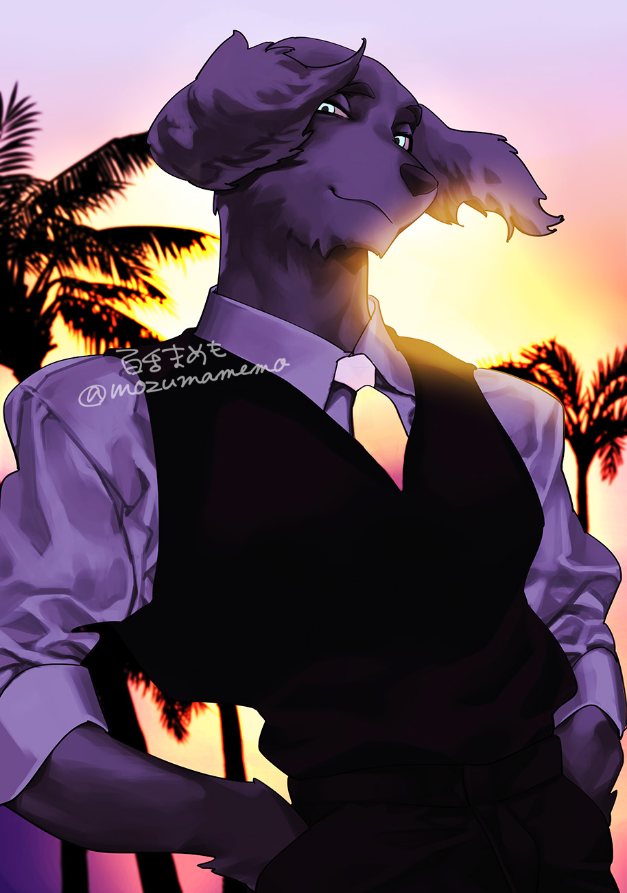 1boy black_fur black_vest blue_eyes body_fur commentary_request dog_boy furry furry_male hands_in_pockets highres looking_at_viewer male_focus mamemo_(daifuku_mame) original outdoors smile solo sunset upper_body vest wind