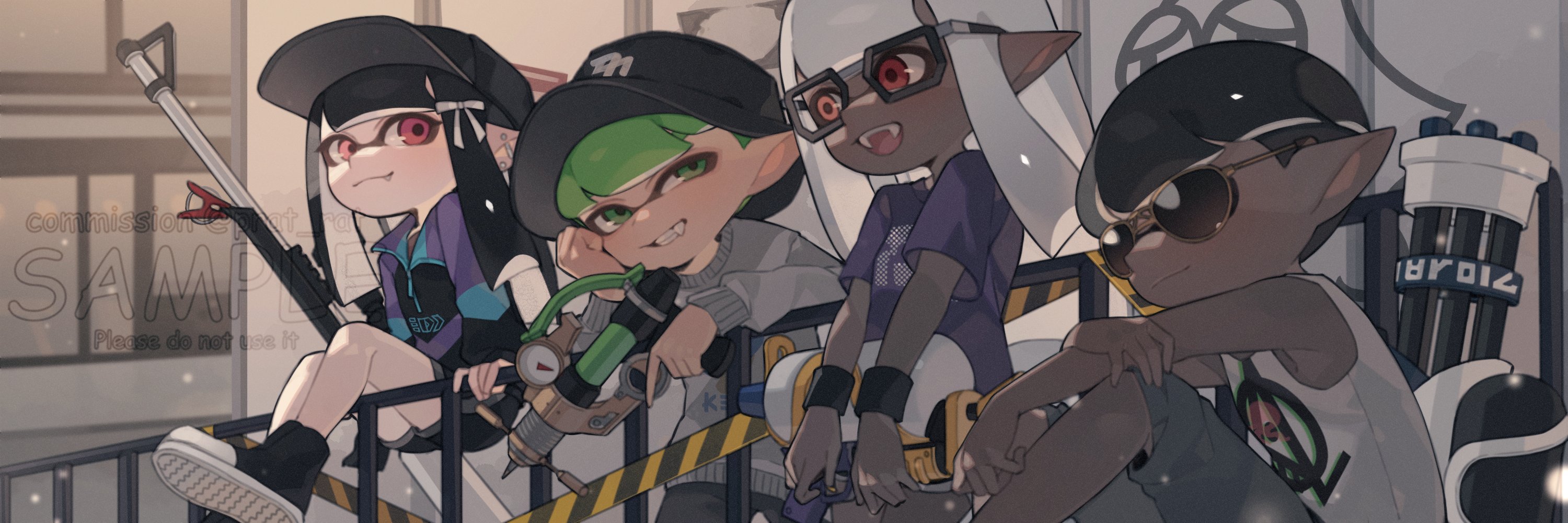 2boys 2girls baseball_cap black-framed_eyewear black_footwear black_hair black_hat black_jacket black_pants black_shorts bow bucket_hat closed_mouth commentary commission dark-skinned_female dark-skinned_male dark_skin dolphin_shorts earrings english_commentary fang fang_out fangs glasses green_eyes green_hair grey_sweater grin hair_bow hand_on_own_cheek hand_on_own_face hat highres inkling inkling_boy inkling_girl inkling_player_character jacket jewelry long_hair looking_at_another mini_splatling_(splatoon) multicolored_jacket multiple_boys multiple_girls nintendo on_railing open_mouth outdoors pants pink_eyes pointy_ears prat_rat purple_shirt railing red_eyes sample_watermark shirt short_hair shorts smile splash-o-matic_(splatoon) splat_charger_(splatoon) splatoon_(series) splattershot_(splatoon) sunglasses sweater tank_top tentacle_hair watermark white_bow white_hair white_tank_top yellow-framed_eyewear zipper_pull_tab