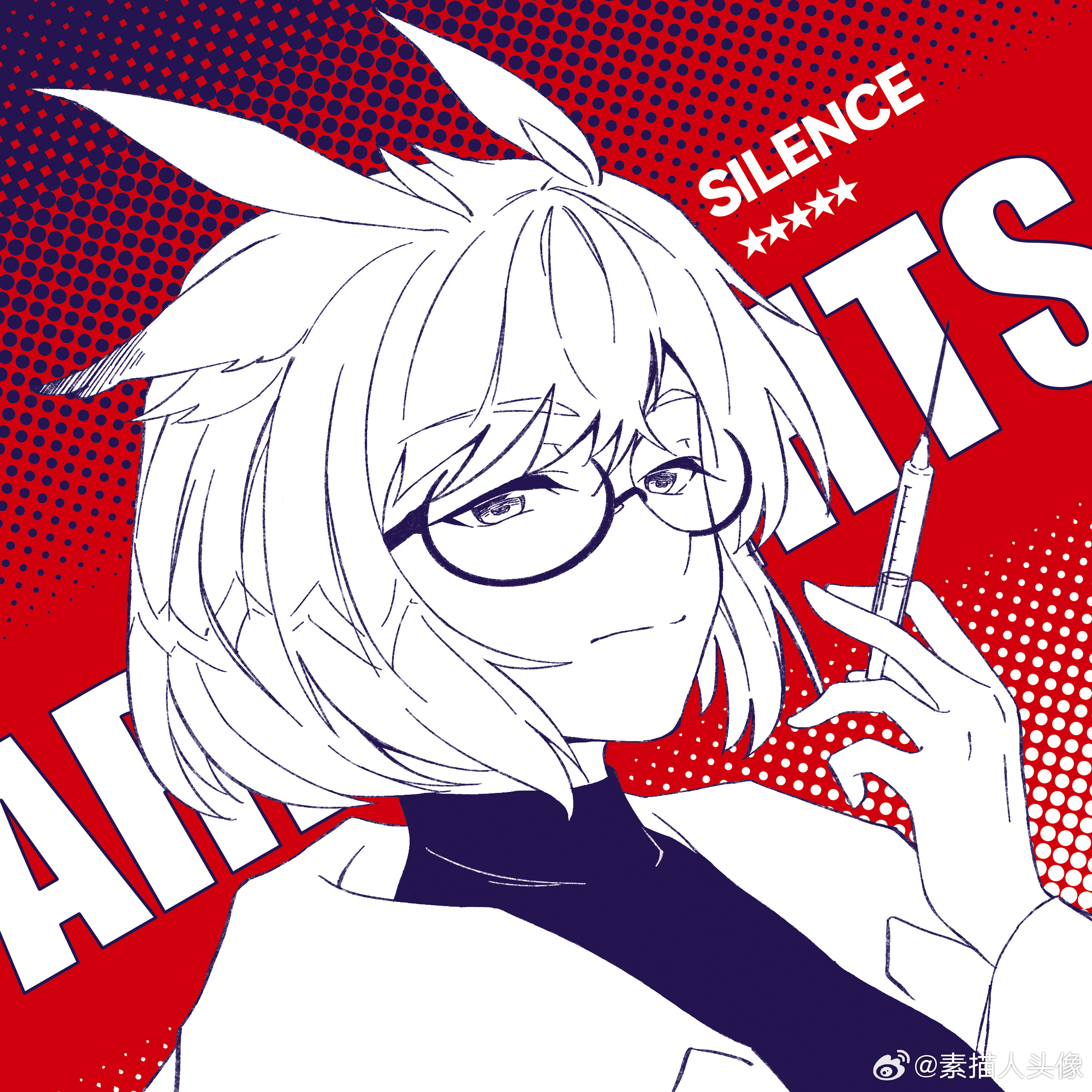 1girl arknights character_name chinese_commentary closed_mouth commentary_request copyright_name glasses greyscale_with_colored_background halftone halftone_background hand_up highres holding holding_syringe looking_at_viewer red_background short_hair silence_(arknights) solo split_mouth star_(symbol) sumiao_ren_touxiang syringe upper_body watermark weibo_watermark weibo_watermark