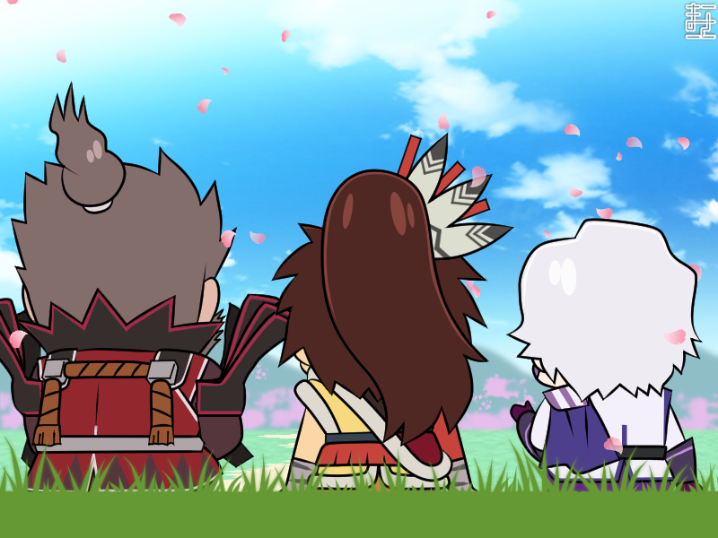 3boys blue_sky brown_hair cherry_blossoms chibi chibi_only from_behind grass hanami long_hair maeda_keiji_(sengoku_basara) male_focus manojimerser multiple_boys official_style on_ground ponytail sengoku_basara short_hair sitting sky takenaka_hanbee_(sengoku_basara) topknot toyotomi_hideyoshi_(sengoku_basara) white_hair