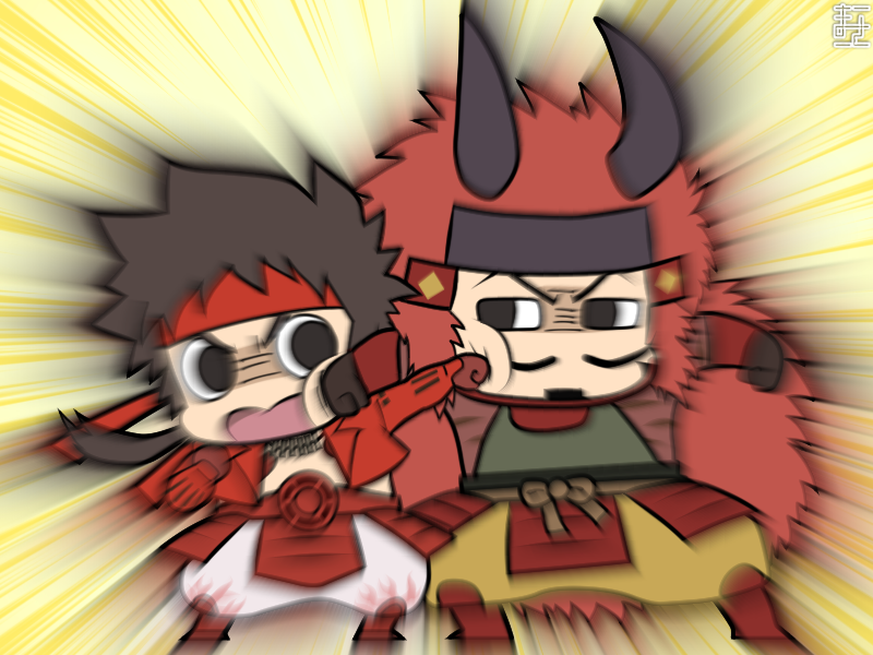 2boys armor brown_hair chibi chibi_only eye_contact facial_hair jacket japanese_armor jewelry long_hair looking_at_another male_focus manojimerser motion_blur motion_lines multiple_boys mustache necklace no_shirt official_style ponytail punching red_jacket sanada_yukimura_(sengoku_basara) sengoku_basara takeda_shingen_(sengoku_basara) yellow_background