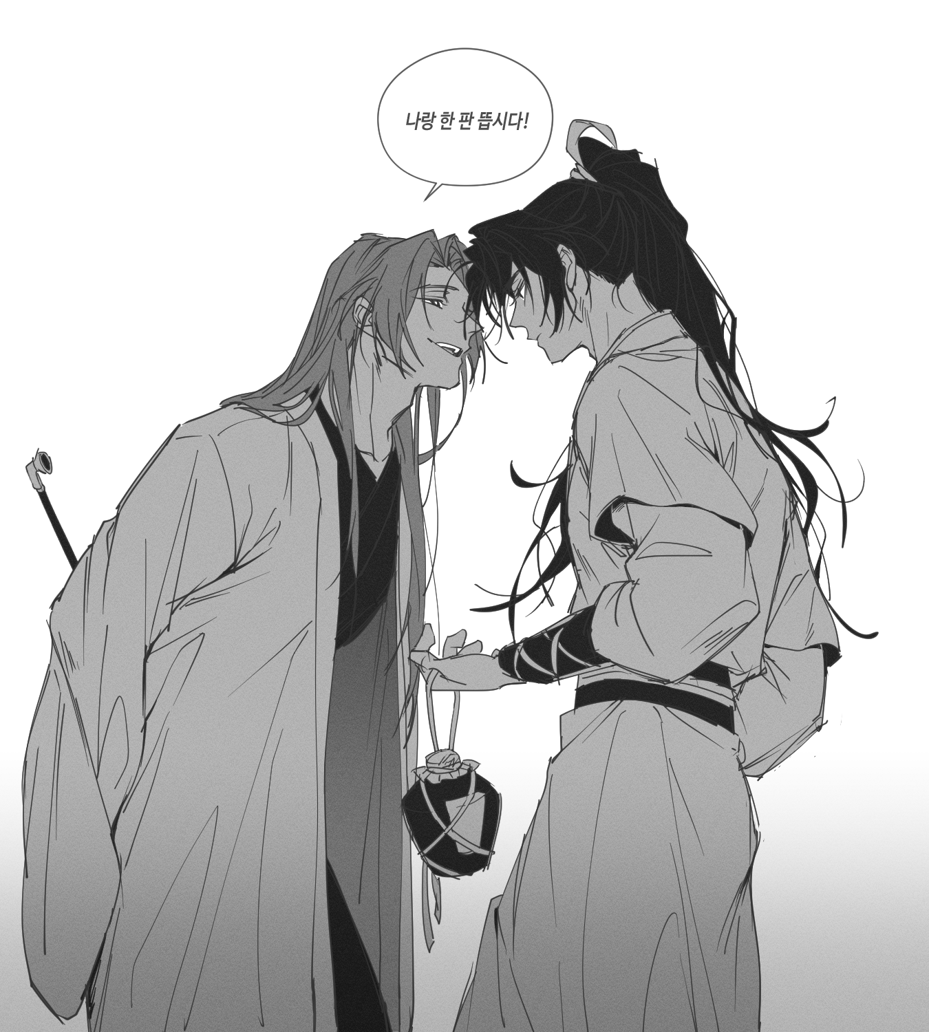 2boys ahoge alcohol arms_behind_back bottle cheongmyeong_(return_of_the_mount_hua_sect) closed_eyes eye_contact gahya00 gradient_background greyscale grin hanbok high_ponytail highres holding holding_bottle kiseru korean_clothes korean_commentary korean_text leaning_forward long_hair long_sleeves looking_at_another male_focus monochrome multiple_boys open_mouth ponytail return_of_the_mount_hua_sect sash smile smoking_pipe standing tang_bo_(return_of_the_mount_hua_sect) teeth upper_body upper_teeth_only wide_sleeves