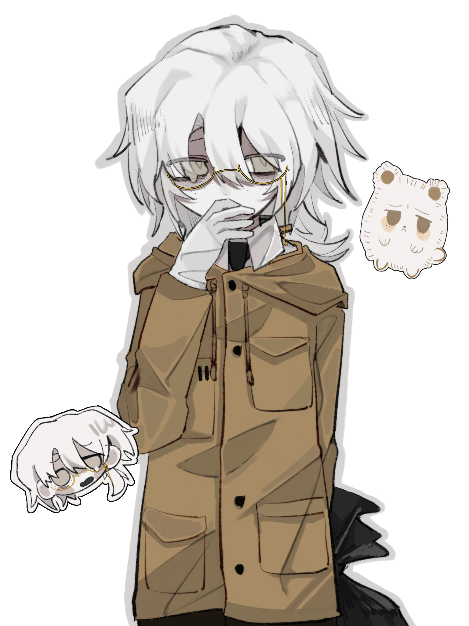 1boy animalization bai_ling_(touqi_guaitan) bear black_necktie border brown_coat chinese_commentary coat collared_shirt commentary_request covering_own_mouth drawstring eyes_visible_through_hair eyewear_strap freckles glasses gloves grey_border grey_eyes grey_outline hair_between_eyes hand_over_own_mouth highres holding holding_behind_back hood hood_down hooded_coat long_sleeves male_focus medium_hair multiple_views necktie open_mouth outline semi-rimless_eyewear shirt simple_background teardrop touqi_guaitan trash_bag upper_body variant_set waffentt white_background white_gloves white_hair white_shirt yellow-framed_eyewear
