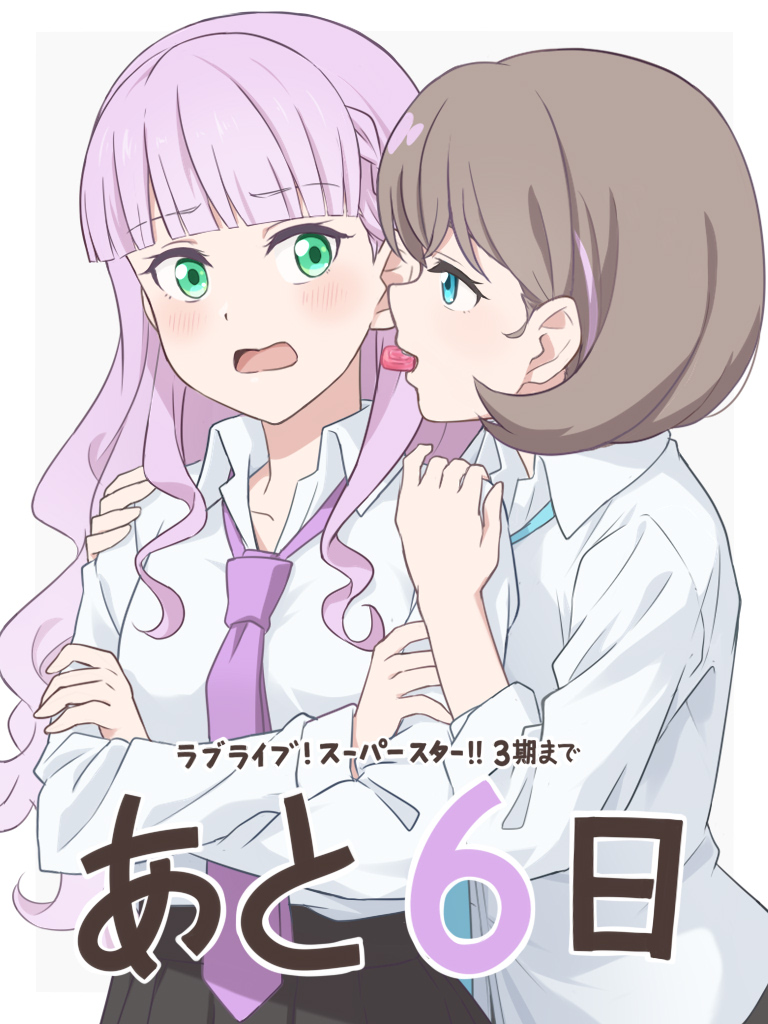 2girls blue_eyes blue_necktie blunt_bangs blush braid brown_hair collarbone collared_shirt commentary_request countdown crossed_arms dress_shirt eye_contact green_eyes half-closed_eyes hands_on_another's_shoulders laofuzi_dai_bansho long_hair long_sleeves looking_at_another love_live! love_live!_superstar!! mouth_hold multiple_girls necktie open_mouth purple_hair purple_necktie school_uniform shirt short_hair side_braids sleeves_past_wrists tang_keke teeth_hold translation_request upper_body very_long_hair wavy_hair white_background white_shirt wien_margarete yuri