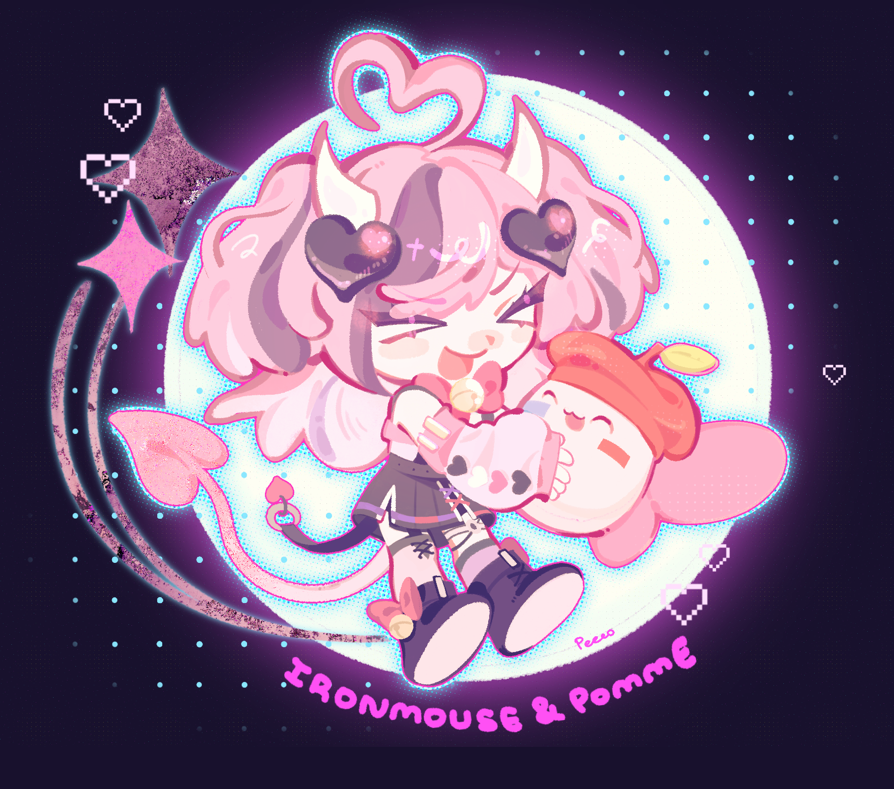 >_< 1girl ^_^ ahoge animate_object apple bell beret bow character_name chibi chibi_only closed_eyes creature demon_girl demon_horns demon_tail egg food food-themed_hat fruit hair_ornament hat heart heart_ahoge heart_hair_ornament highres holding holding_creature horns ironmouse ironmouse_(15th_costume) jingle_bell minecraft_youtube multicolored_hair peeco_0 pink_hair pomme_(quackity_smp) purple_hair quackity_smp skirt streaked_hair tail twintails virtual_youtuber vshojo wings