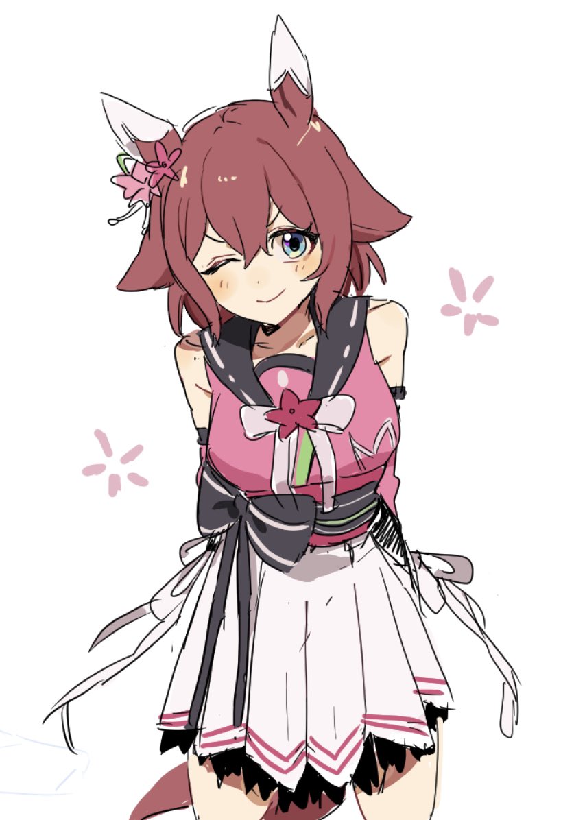 1girl animal_ears arms_behind_back blue_eyes blush breasts commentary_request detached_sleeves g3siuvkkn884989 hair_flaps hair_ornament horse_ears horse_girl horse_tail looking_at_viewer one_eye_closed pink_hair sakura_chiyono_o_(strength_in_full_bloom)_(umamusume) sakura_chiyono_o_(umamusume) solo tail umamusume white_background