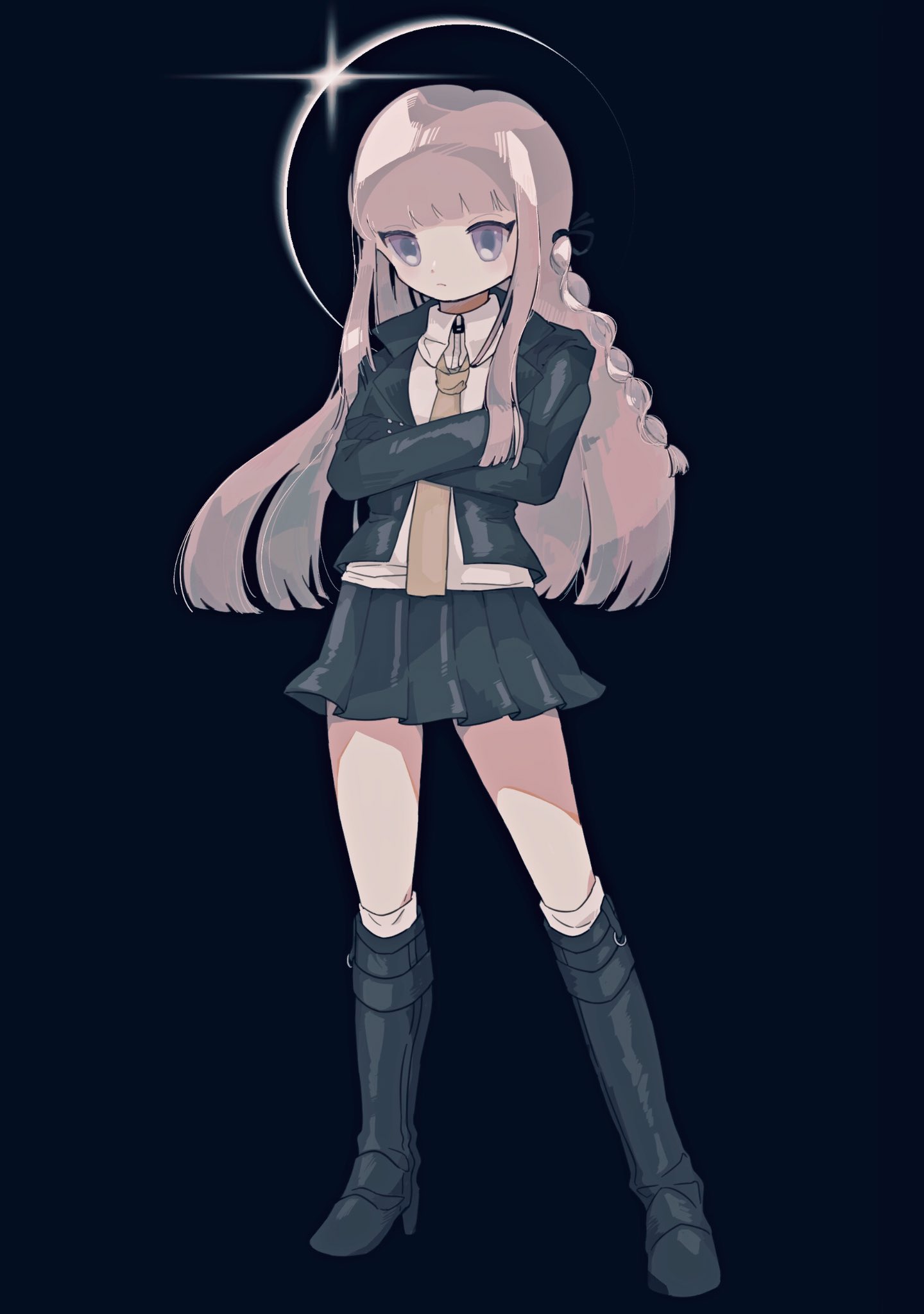 1girl belt belt_buckle black_background black_belt black_boots black_gloves black_jacket black_ribbon black_skirt blazer blunt_bangs blunt_ends boots braid buckle closed_mouth collared_jacket collared_shirt crossed_arms danganronpa:_trigger_happy_havoc danganronpa_(series) dot_nose eclipse expressionless full_body gleam gloves hair_ribbon high_heel_boots high_heels highres jacket kara_aren kirigiri_kyoko knee_boots lapels light_blush long_hair looking_ahead miniskirt necktie notched_lapels open_clothes open_jacket orange_necktie over-kneehighs pleated_skirt purple_eyes purple_hair ribbon shirt shoe_belt sidelocks single_braid skirt socks solo standing studded_gloves thighhighs very_long_hair white_shirt white_socks