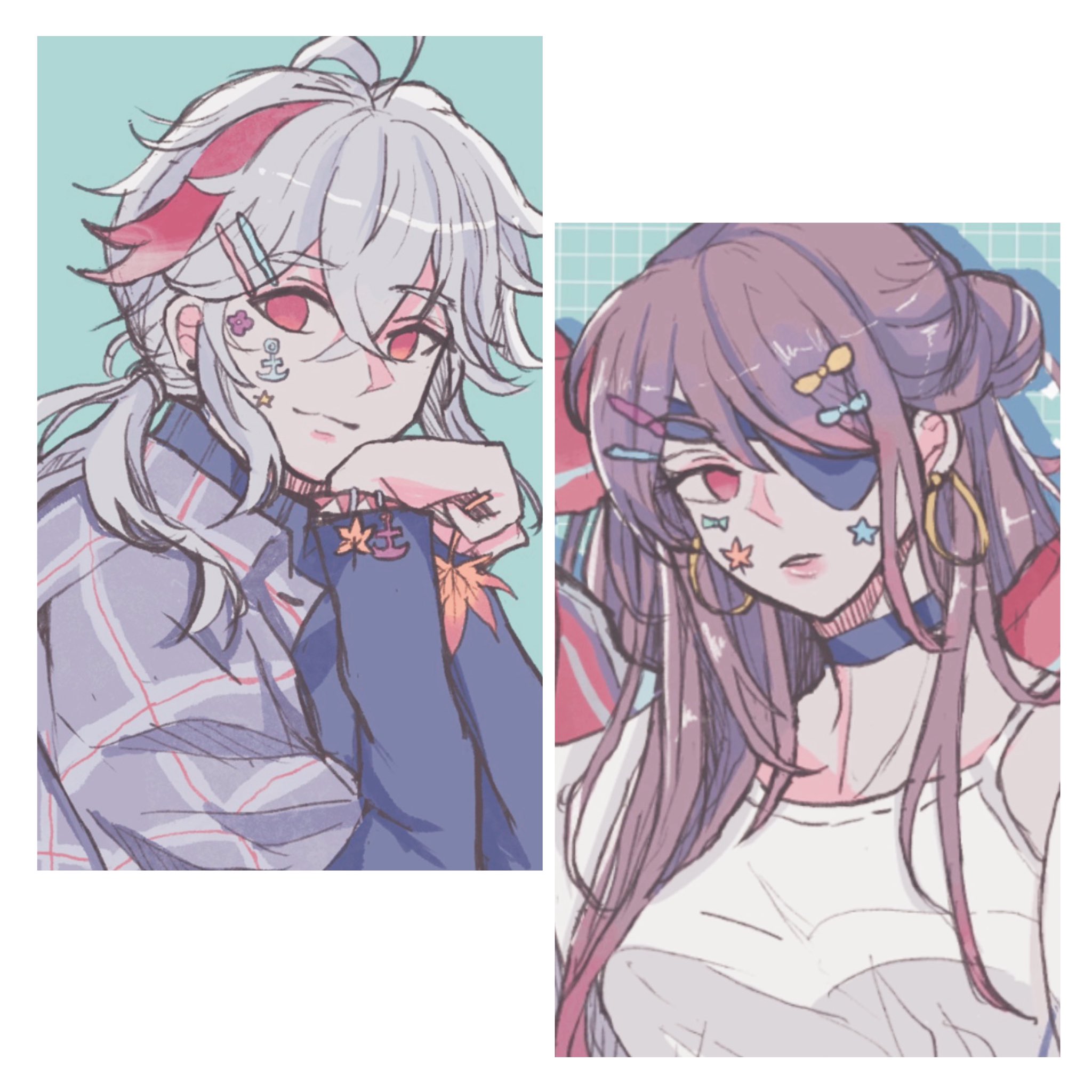 1boy 1girl ahoge alternate_costume beidou_(genshin_impact) black_choker brown_hair choker collarbone ear_piercing earrings eyepatch genshin_impact grey_hair hair_between_eyes hair_bun hair_ornament hair_over_one_eye hairclip highres jacket jewelry kaedehara_kazuha kasep long_hair looking_at_viewer multicolored_hair open_mouth piercing red_eyes red_hair shirt short_hair smile streaked_hair two-tone_hair upper_body white_hair