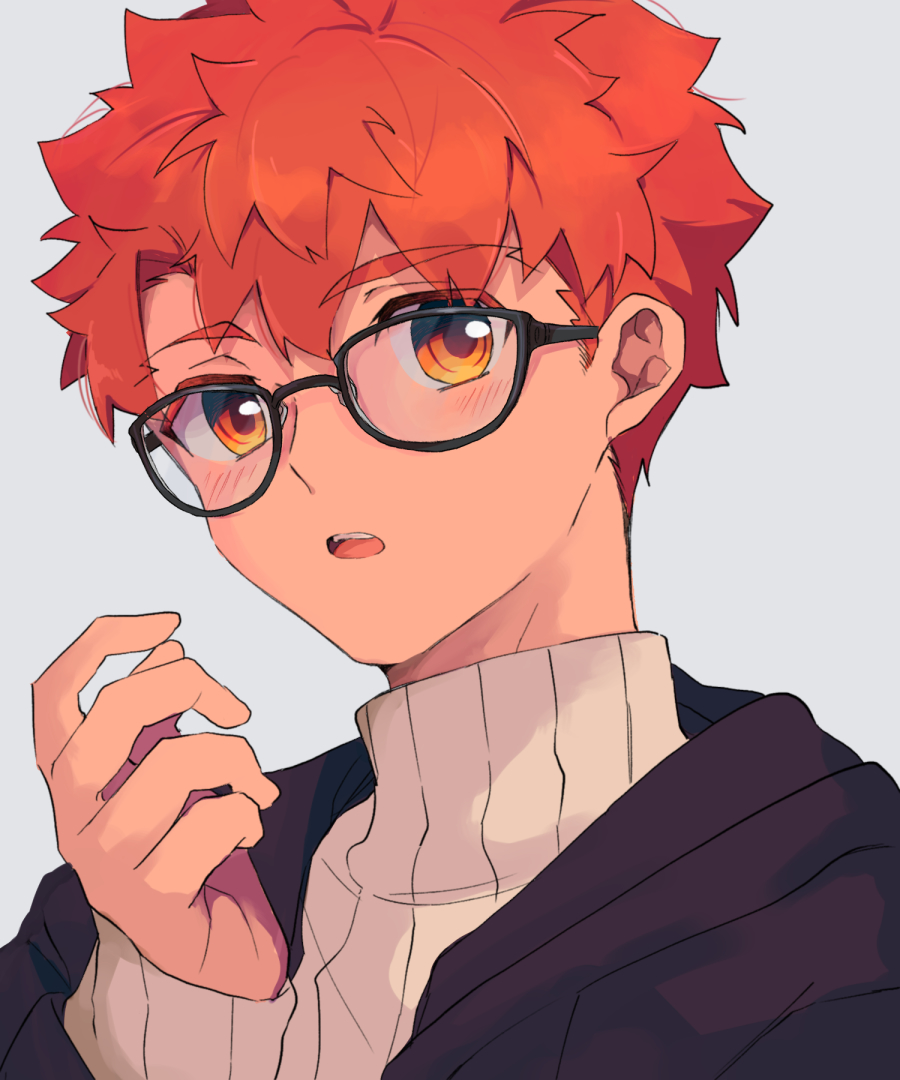 1boy bespectacled black_jacket brown_sweater commentary_request emiya_shirou fate/stay_night fate_(series) glasses jacket kamo_0707 male_focus open_mouth orange_eyes orange_hair portrait sleeves_past_wrists solo sweater turtleneck turtleneck_sweater