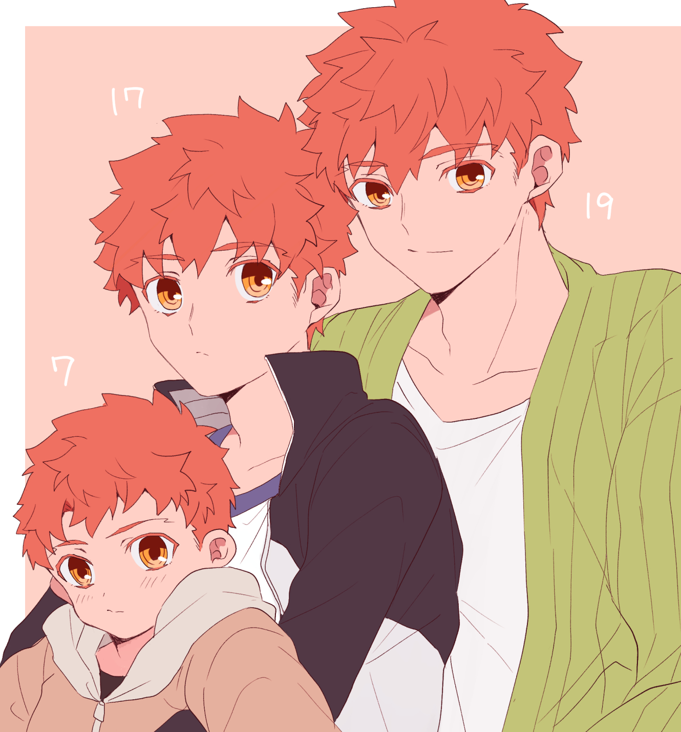 3boys :/ aged_down brown_jacket carrying child commentary_request emiya_shirou fate/stay_night fate_(series) green_jacket highres hood hooded_jacket jacket kamo_0707 male_focus multicolored_jacket multiple_boys multiple_persona orange_eyes orange_hair smile two-tone_jacket