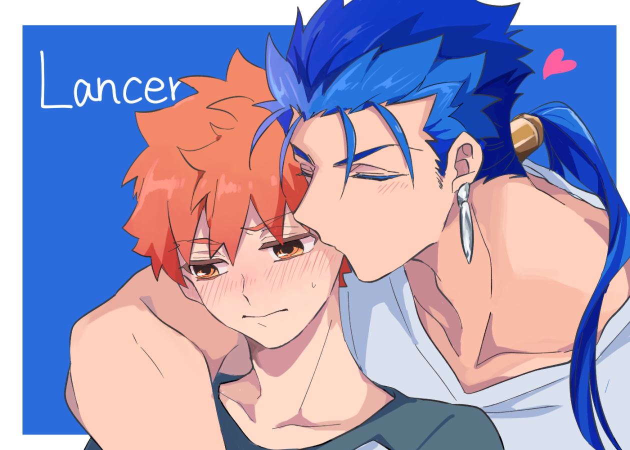 2boys blue_eyes blush character_name collarbone commentary_request cu_chulainn_(casual_wear)_(fate) cu_chulainn_(fate) cu_chulainn_(lancer)_(fate) earrings emiya_shirou fate/stay_night fate_(series) heart jewelry kamo_0707 kiss kissing_cheek long_hair male_focus multiple_boys orange_eyes orange_hair ponytail shirt shy sweatdrop t-shirt two-tone_shirt yaoi