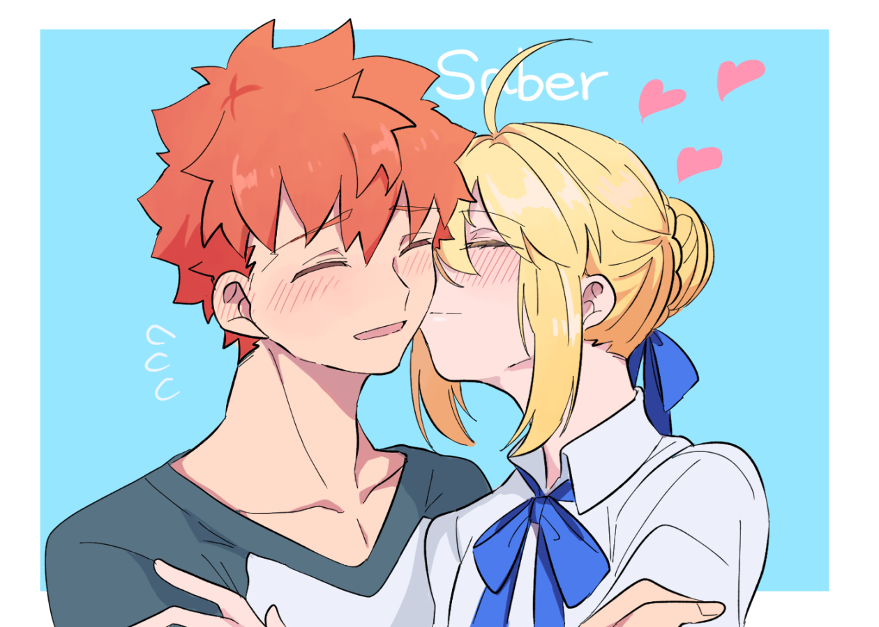 1boy 1girl ahoge artoria_pendragon_(fate) blonde_hair braid character_name commentary_request emiya_shirou fate/stay_night fate_(series) flying_sweatdrops hair_bun heart hetero kamo_0707 kiss kissing_cheek orange_hair saber_(fate) sidelocks single_hair_bun two-tone_shirt