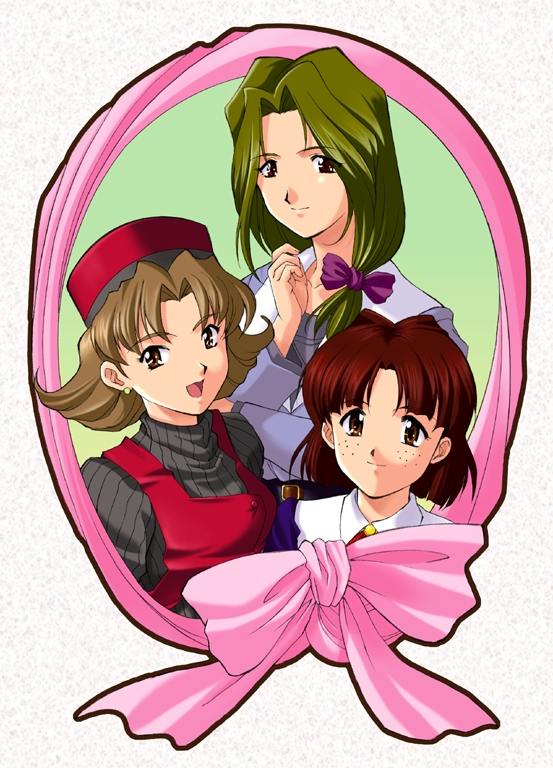 1990s_(style) alternate_costume belt belt_buckle black_outline blue_sleeves bow brown_belt brown_eyes buckle buttons closed_mouth collar earrings flipped_hair freckles fujii_kasumi gold_buckle gradient_background green_hair grey_collar grey_shirt grey_sleeves hair_intakes headwear_request jewelry long_hair looking_at_viewer low-tied_long_hair low_ponytail non-web_source official_alternate_costume official_art open_mouth outline parted_bangs parted_lips pink_ribbon ponytail purple_bow retro_artstyle ribbon sakakibara_yuri sakura_taisen sega shirt short_hair simple_background smile takamura_tsubaki tongue turtleneck white_background white_collar yamaguchi_yasushi