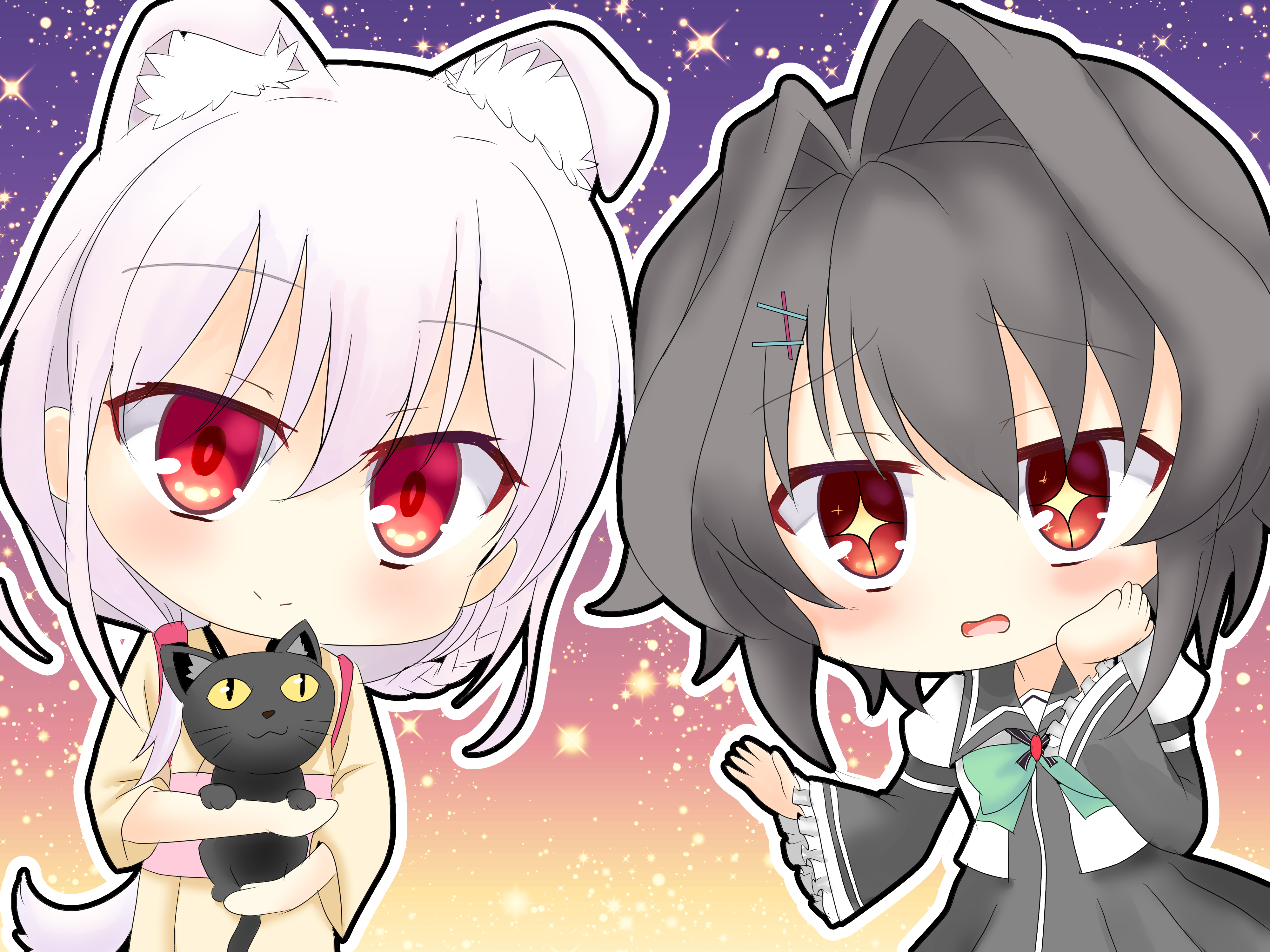 +_+ 2girls 9-nine- absurdres animal animal_ear_fluff animal_ears black_cat black_hair blush bow braid bright_pupils cat chibi chibi_only closed_mouth commentary_request crossover dog_ears dog_girl dog_tail eyes_visible_through_hair frilled_sleeves frills gradient_background green_bow hair_between_eyes hair_intakes hair_ornament hairclip hand_on_own_cheek hand_on_own_face highres holding holding_animal holding_cat juliet_sleeves kotoyose_fumino long_sleeves looking_at_animal looking_at_another multiple_girls nukigee_mitai_na_shima_ni_sunderu_watashi_wa_dou_surya_ii_desu_ka? open_mouth puffy_sleeves raised_eyebrows red_eyes school_uniform short_hair simple_background single_braid smile split_mouth tail upper_body wavy_mouth yuku0307 yuuki_noa