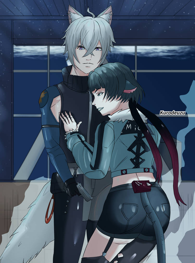 ass couple eye_contact hetero hug jane_doe_(zenless_zone_zero) kurodeuzu looking_at_another non-web_source seth_lowell zenless_zone_zero