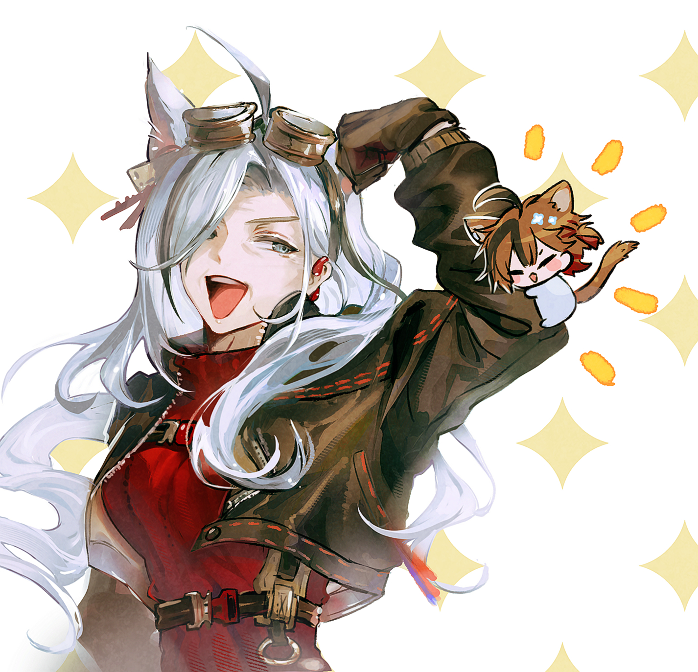 1girl animal_ears arknights brown_gloves brown_hair brown_jacket catherine_(arknights) eyewear_on_head gloves hair_over_one_eye hearing_aid highres jacket long_hair mini_person myluche old old_woman open_clothes open_jacket open_mouth red_sweater simple_background smile stainless_(arknights) sweater teeth upper_body upper_teeth_only white_background white_hair