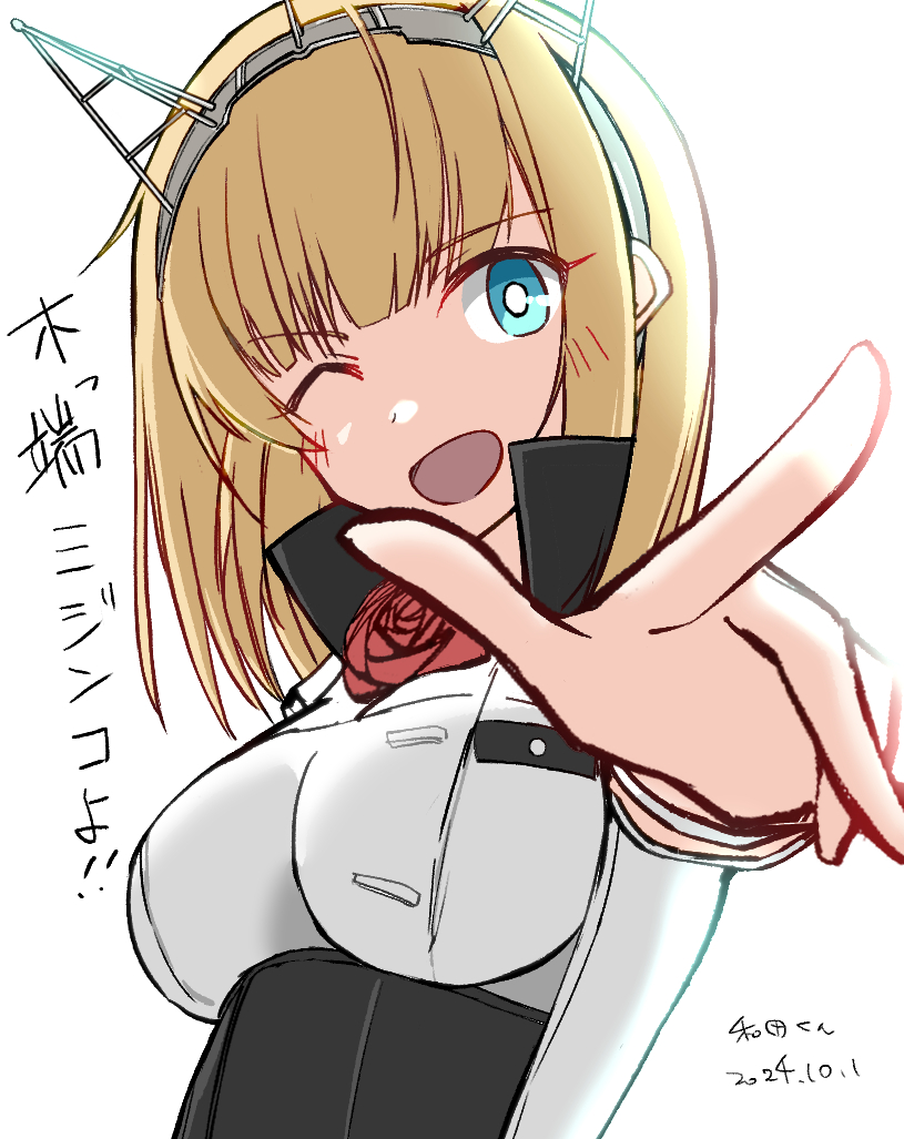1girl blonde_hair blue_eyes commentary_request dated flower foreshortening hairband headgear kantai_collection military_uniform one_eye_closed open_mouth red_flower red_rose rodney_(kancolle) rose short_hair smile solo translation_request twitter_username wada-kun