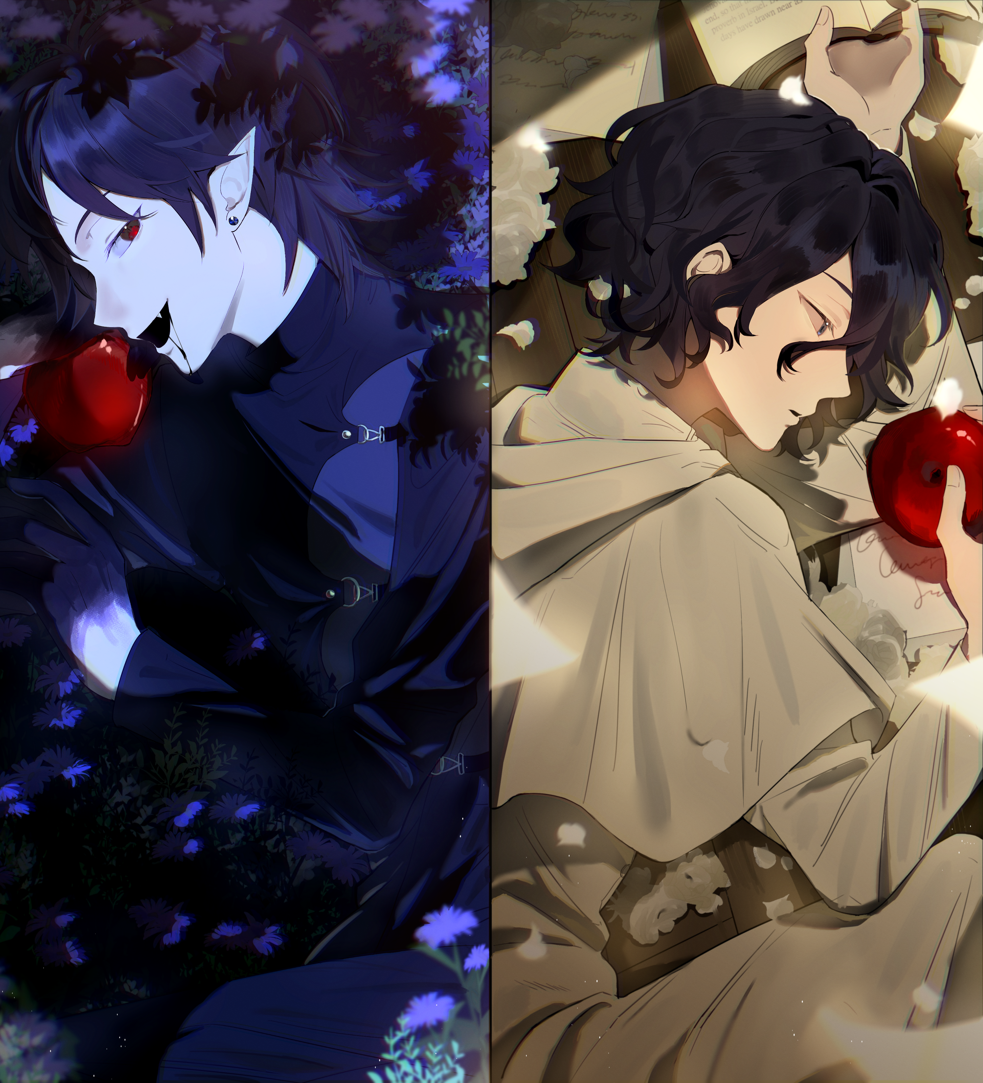 2boys absurdres apple black_footwear black_hair black_jacket black_pants chinese_commentary coat commentary_request earrings fang food food_bite fruit harada_minoru highres holding holding_food holding_fruit icey1117 jacket jewelry light_brown_hair long_sleeves male_focus multiple_boys open_mouth pants pointy_ears red_eyes saibou_shinkyoku shirt short_hair smile stud_earrings utsugi_noriyuki white_coat white_shirt