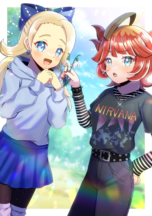 :d belt belt_buckle black_belt black_pants black_shirt blonde_hair blue_bow blue_eyes blue_hoodie blue_skirt blurry blurry_background blush bow breasts brown_pantyhose buckle clothes_writing commentary_request commission day depth_of_field forehead green_eyes hair_bow hand_up hands_up holding hood hood_down hoodie kou_hiyoyo layered_sleeves light_brown_hair long_hair long_sleeves loose_socks mela_(pokemon) mtv_unplugged_in_new_york_(nirvana_album) multicolored_hair nail_polish nintendo nirvana_(band) open_mouth original pants pantyhose parted_bangs pleated_skirt pokemon pokemon_scarlet_and_violet puffy_long_sleeves puffy_sleeves red_hair red_nails shirt short_over_long_sleeves short_sleeves skeb_commission skirt sleeves_past_wrists small_breasts smile socks spikes striped_clothes striped_shirt thighhighs two-tone_hair white_thighhighs
