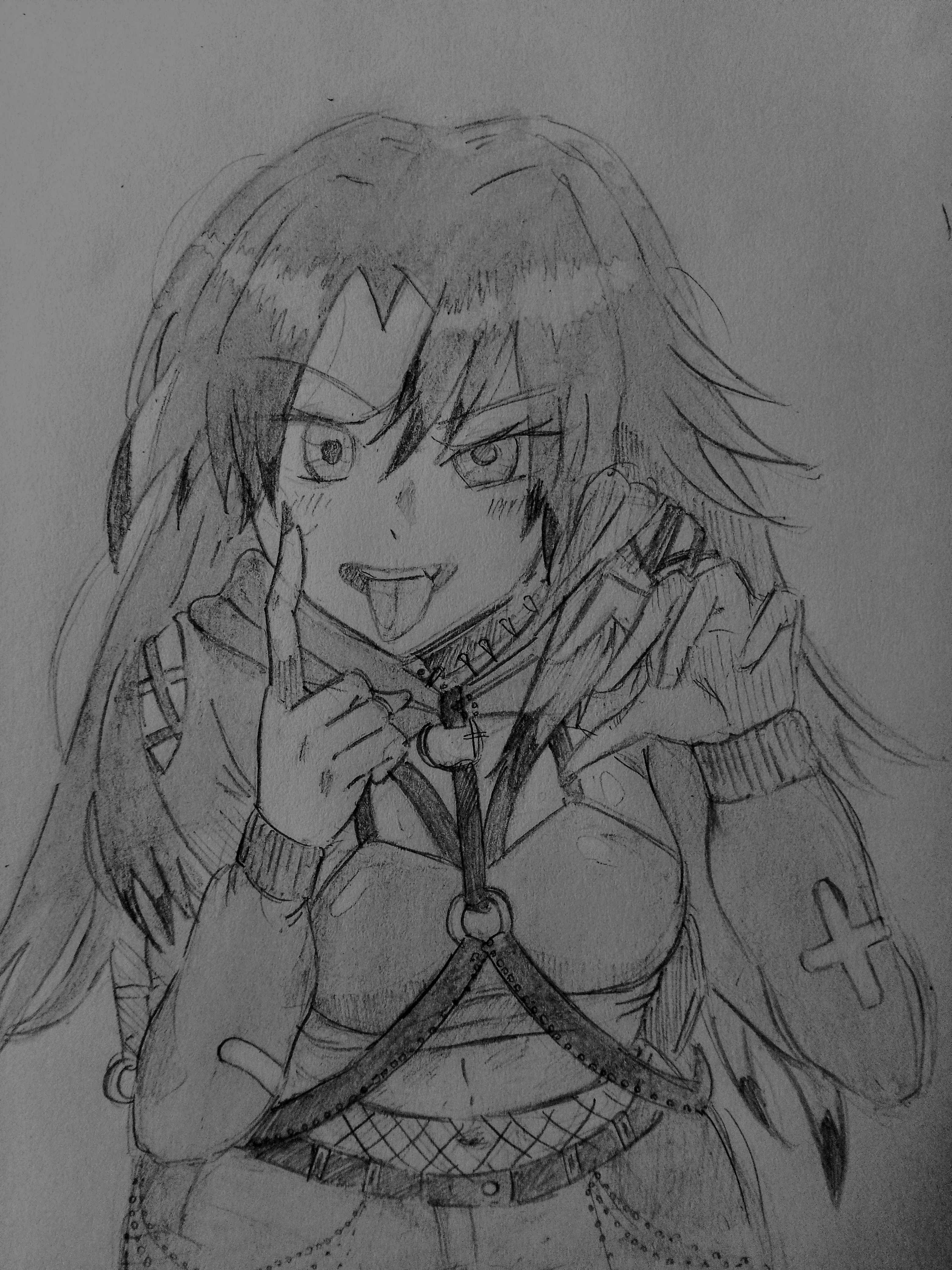 1girl absurdres alice_leah aly_doppelbvnger black_dress brown_hair dress freckles goth_fashion hand_up highres long_hair looking_at_viewer original red_eyes sketch solo sports_bra tongue tongue_out