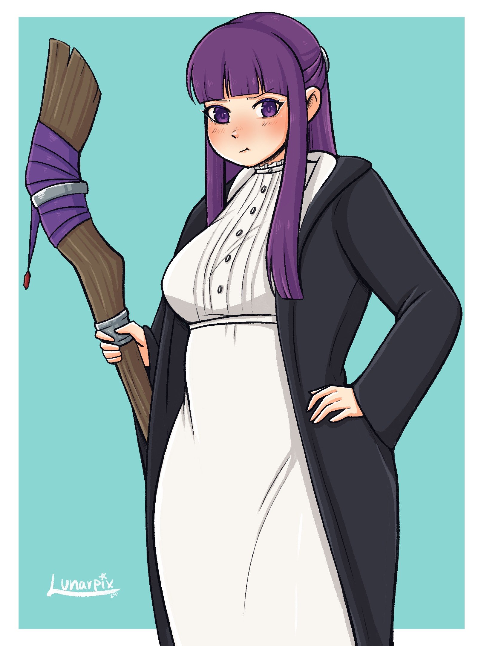 1girl artist_logo artist_name border breasts fern_(sousou_no_frieren) highres logo lunarpix_(artist) purple_eyes purple_hair solo sousou_no_frieren standing white_border
