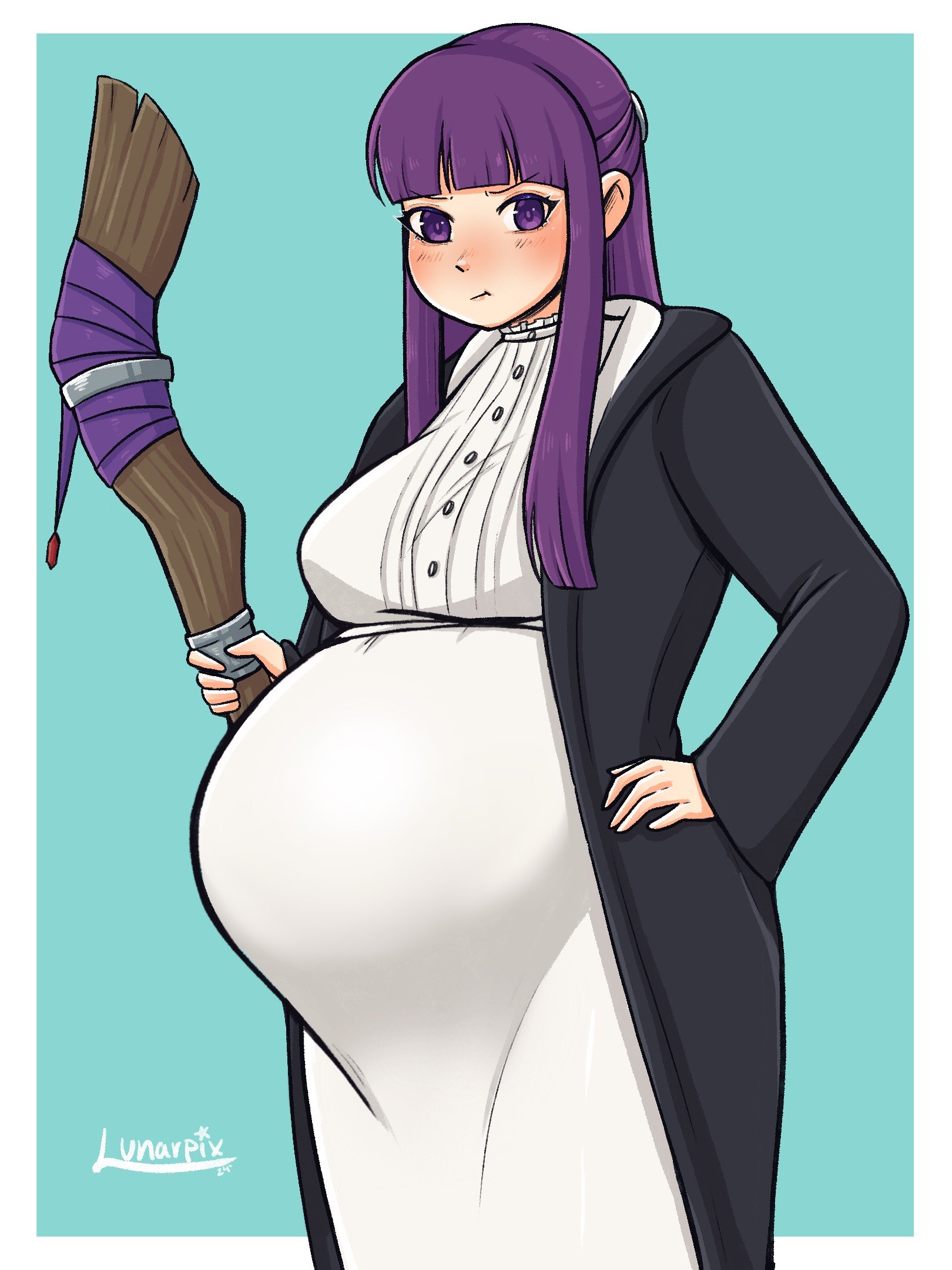 1girl artist_logo artist_name belly big_belly border breasts fern_(sousou_no_frieren) highres logo lunarpix_(artist) pregnant purple_eyes purple_hair solo sousou_no_frieren stomach white_border