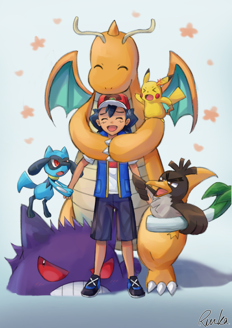 1boy anger_vein antennae ash_ketchum black_eyes black_hair brown_eyes claws closed_eyes colored_sclera dragonite flower galarian_farfetch'd galarian_form gen_1_pokemon gen_4_pokemon gen_8_pokemon gengar highres holding horns hug jacket male_focus nintendo petals pikachu pokemon pokemon_(anime) pokemon_(creature) pokemon_journeys red_eyes red_sclera riolu ru_ka_p single_horn standing unibrow wings