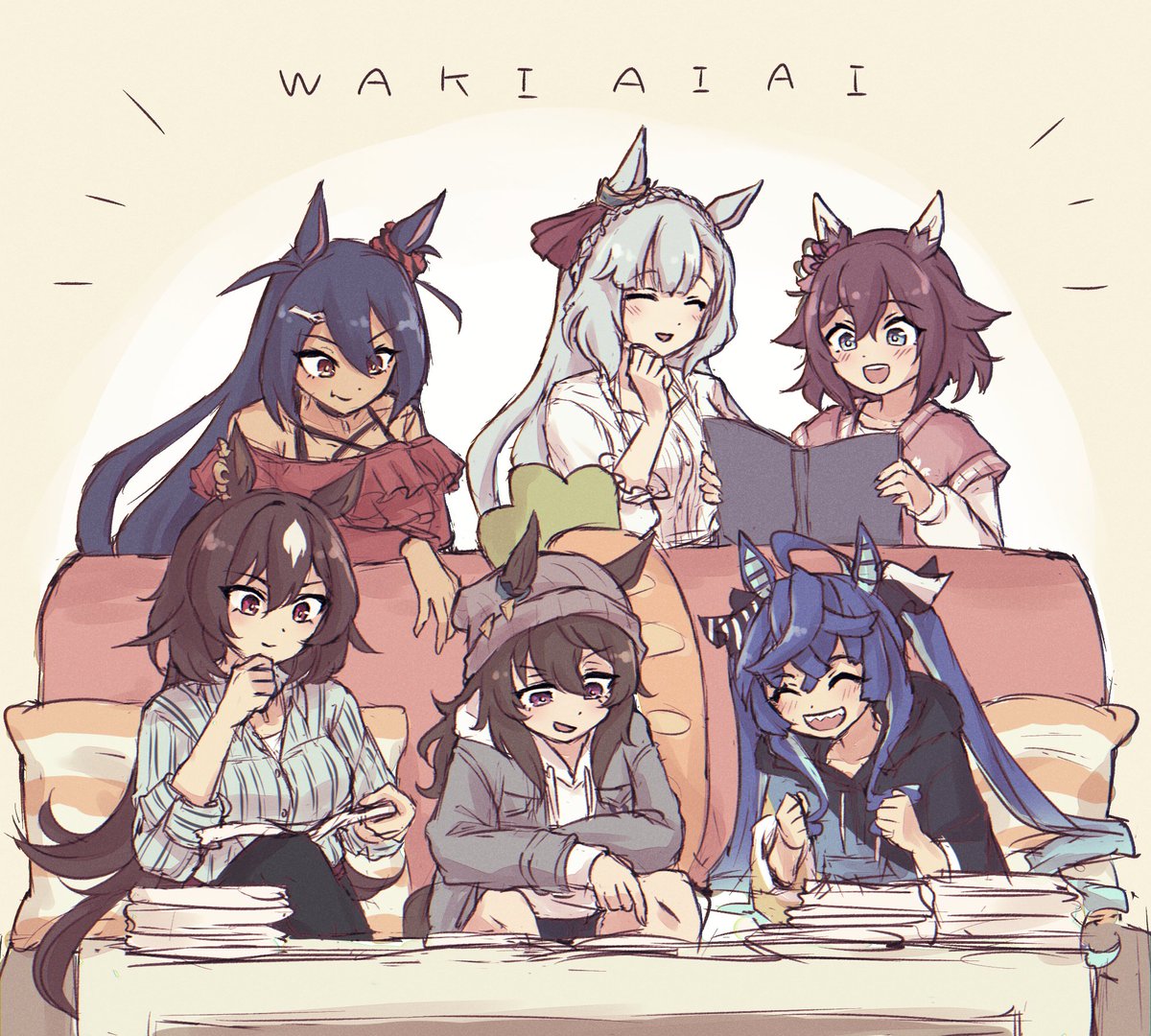 6+girls ^_^ ahoge animal_ears beanie black_hair blue_hair book bow braid brown_eyes brown_hair casual closed_eyes closed_mouth coffee_table commentary_request couch crossed_bangs ear_ornament ears_through_headwear grey_eyes hair_bow hair_ornament hairclip hand_up hands_up hat hishi_amazon_(umamusume) holding holding_book hood hoodie horse_ears horse_girl jacket long_hair long_sleeves medium_hair mejiro_ardan_(umamusume) multicolored_hoodie multiple_girls nakayama_festa_(umamusume) namuko off_shoulder official_alternate_costume on_couch open_clothes open_jacket open_mouth pillow red_eyes sakura_chiyono_o_(umamusume) sharp_teeth shirt sidelocks sirius_symboli_(umamusume) sitting striped_bow table teeth twin_turbo_(umamusume) twintails umamusume white_hair white_shirt