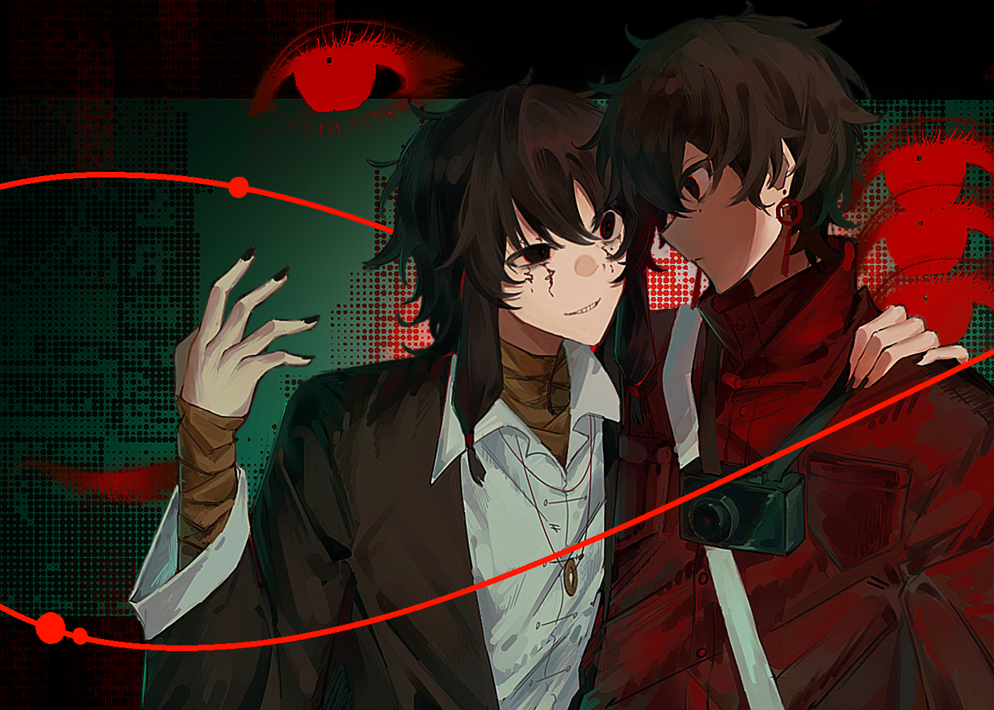 2boys bandaged_arm bandaged_neck bandages black_eyes black_gloves black_hair black_jacket camera camera_around_neck chinese_commentary closed_mouth coin coin_on_string collared_shirt commentary_request earrings facepaint gloves grin hand_on_another's_shoulder high_collar holed_coin jacket jewelry li_yuting_(male) long_sleeves male_focus multiple_boys necklace open_clothes open_jacket oxo5756644 red_jacket shirt short_hair_with_long_locks smile touqi_guaitan uneven_eyes white_shirt ziche_fuzhao