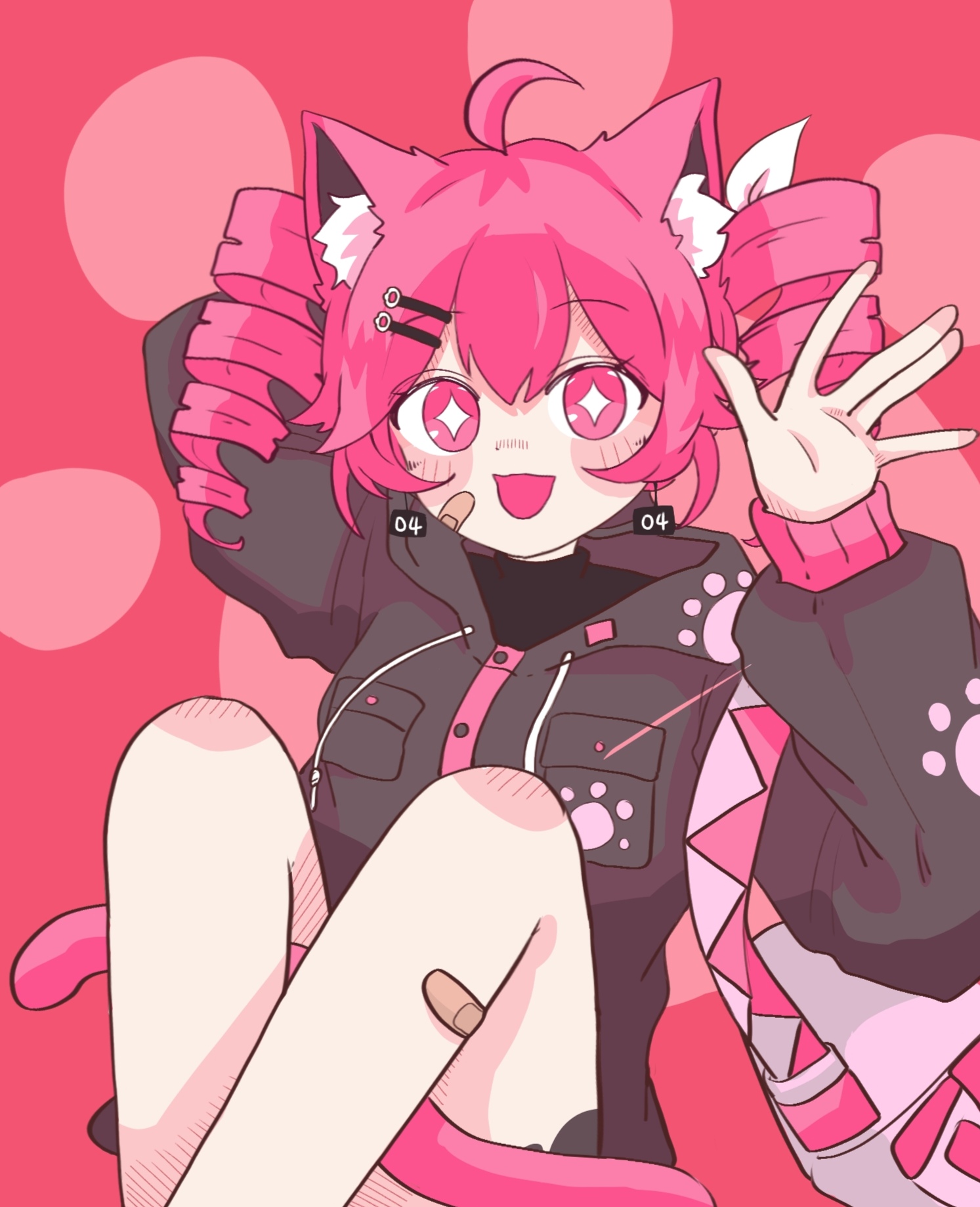 +_+ 1girl ahoge animal_ear_fluff animal_ears arm_behind_head arm_up bandaid bandaid_on_face bandaid_on_leg black_jacket black_shirt blush_stickers cat_ears cat_girl cat_tail daofeng_(daofeng3330) drill_hair earrings feet_out_of_frame hair_ornament hairclip hand_up highres hood hooded_jacket jacket jewelry kasane_neko_(haru57928031) kasane_teto kasane_teto_(utau) knees_up long_sleeves open_mouth paw_print paw_print_pattern pink_eyes pink_hair puffy_long_sleeves puffy_sleeves red_background shirt short_hair sitting smile solo tail twin_drills utau waving