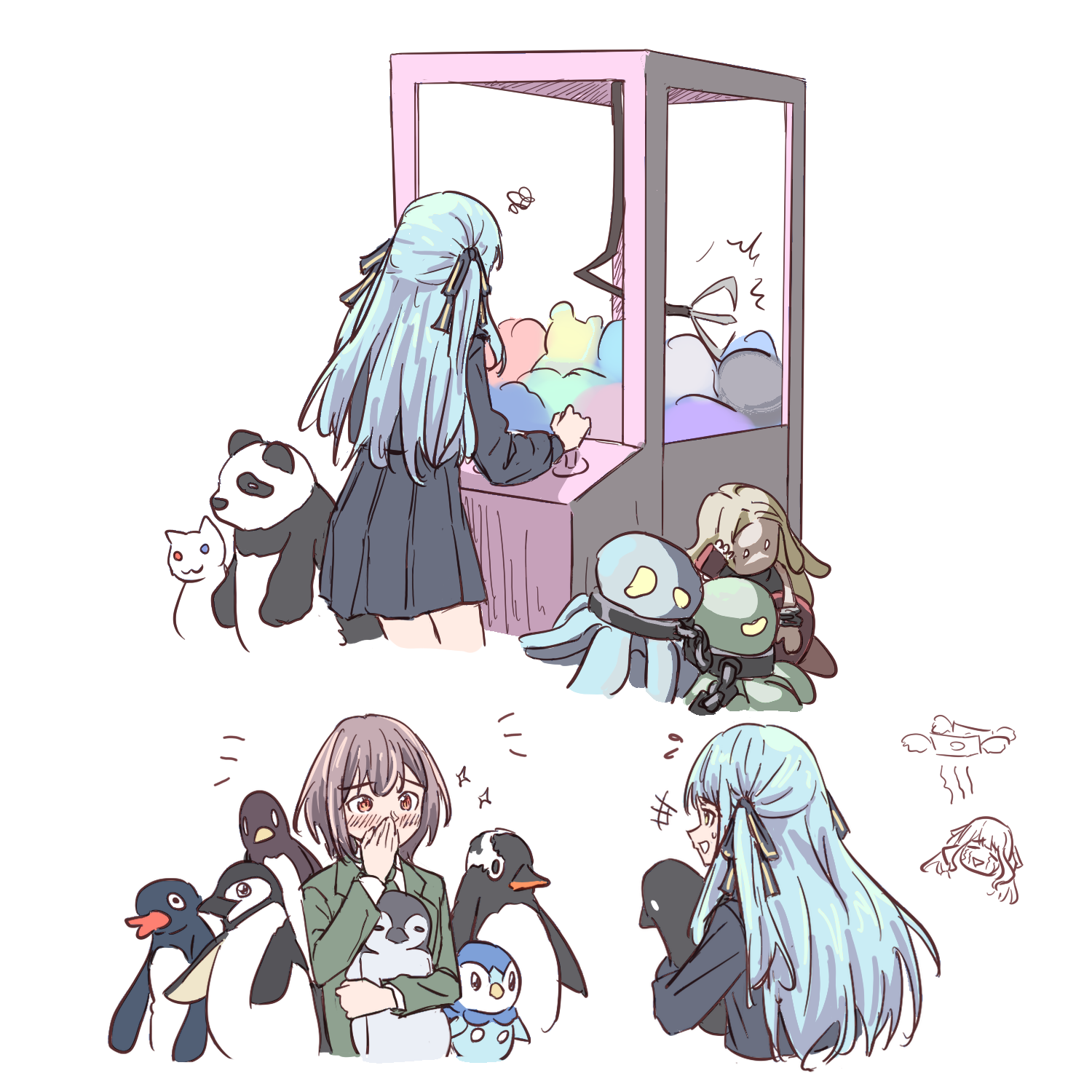 anjuro_zeeku bang_dream! bang_dream!_it's_mygo!!!!! black_ribbon blazer blue_hair blue_shirt blue_skirt blush brown_eyes commentary crane_game green_jacket green_necktie grey_hair hair_ribbon highres jacket long_hair long_sleeves necktie open_mouth ribbon romaji_commentary school_uniform shirt short_hair skirt sparkle stuffed_animal stuffed_panda stuffed_penguin stuffed_toy sweatdrop takamatsu_tomori togawa_sakiko tsukinomori_school_uniform two_side_up