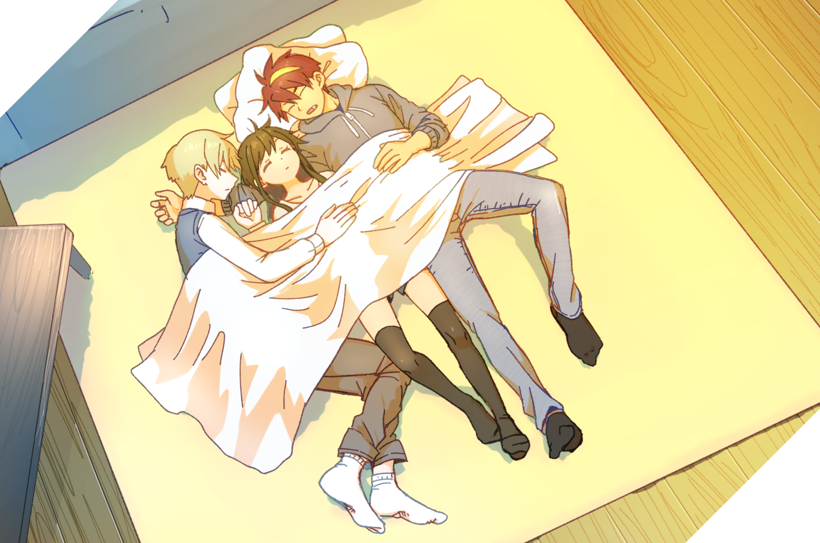 1girl 2boys amatsuka_yui asadoke_no_majo blanket blonde_hair blue_sweater_vest brown_hair charlotte_(asadoke_no_majo) closed_eyes highres hood hoodie indoors jacket long_hair multicolored_hair multiple_boys nogi_shuichi official_art poreisan_(portrain) red_hair sharp_teeth short_hair sleeping slice_of_life streaked_hair sweater_vest teeth thighhighs under_covers