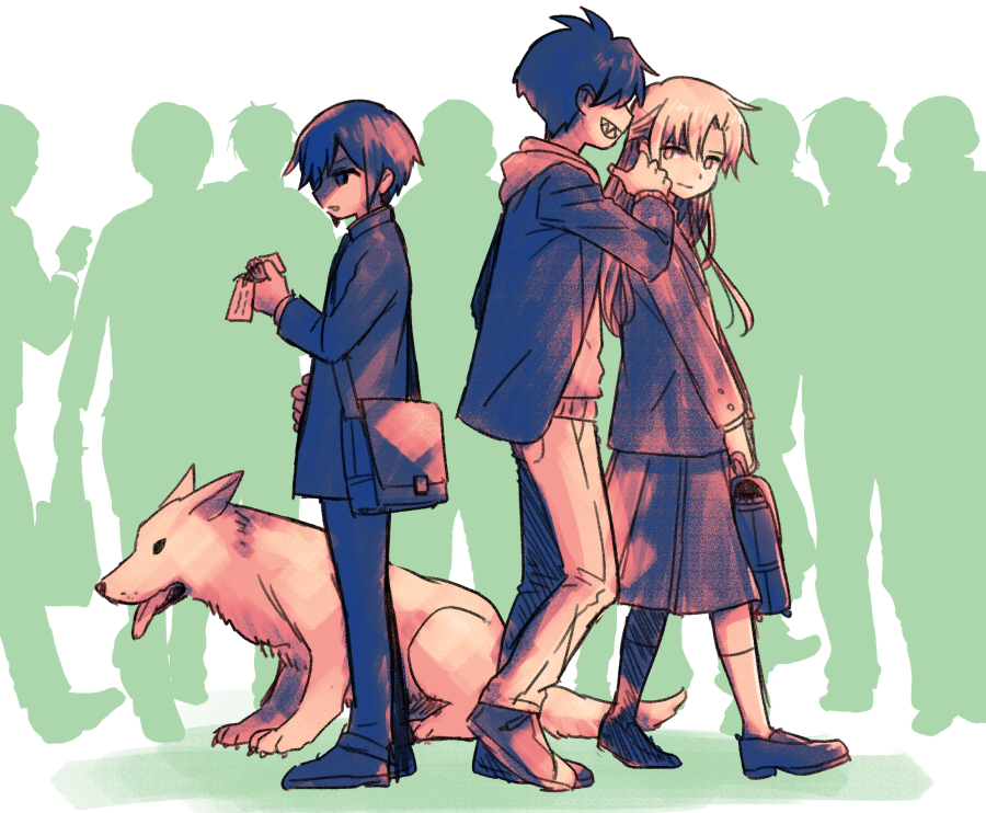 1girl 2boys aged_down amatsuka_yui asadoke_no_majo blazer blonde_hair charlotte_(asadoke_no_majo) crossdressing dog gakuran hood hoodie jacket long_hair long_skirt multiple_boys nogi_shuichi official_art pleated_skirt poreisan_(portrain) school_uniform sharp_teeth short_hair skirt teeth