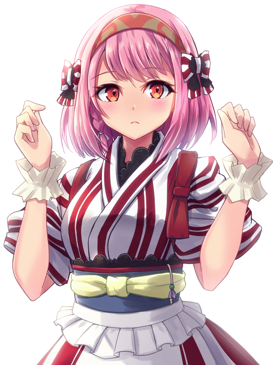 1girl alternate_costume braid closed_mouth fire_emblem fire_emblem_engage grey_hairband hairband highres japanese_clothes lapis_(fire_emblem) looking_at_viewer minamonochaba multicolored_hairband nintendo pink_eyes pink_hair red_eyes red_hairband side_braid solo two-tone_hairband