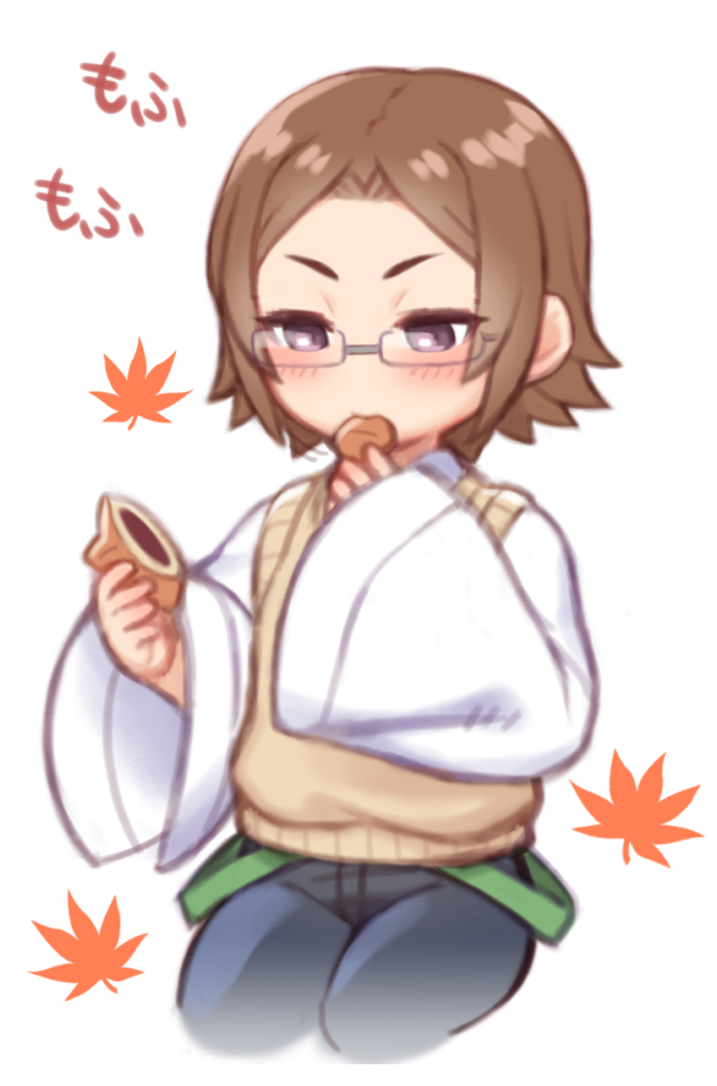 1boy blush brown_hair brown_sweater_vest contrast_suspenders cropped_legs denim eating folks_(nabokof) gakuen_basara glasses jeans leaf looking_at_food male_focus maple_leaf mouri_motonari_(sengoku_basara) pants purple_eyes sengoku_basara shirt simple_background sleeves_past_wrists solo suspenders suspenders_hanging sweater_vest white_background white_shirt wide_sleeves