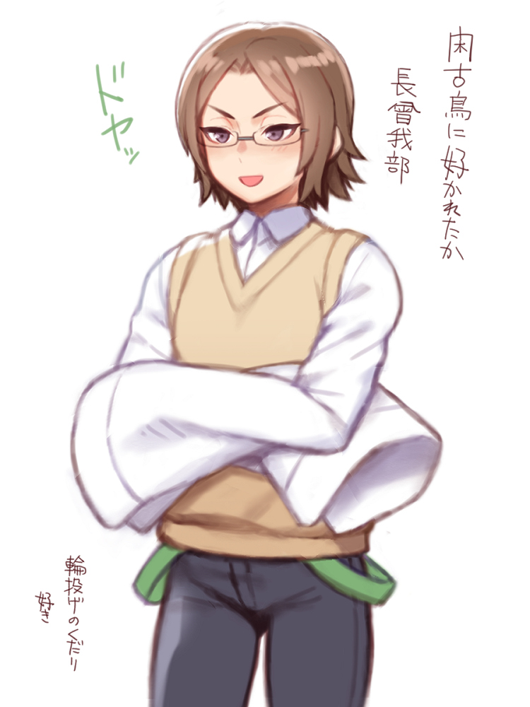 1boy :d brown_hair brown_sweater_vest collared_shirt contrast_suspenders cowboy_shot crossed_arms denim folks_(nabokof) gakuen_basara glasses jeans light_blush looking_ahead male_focus mouri_motonari_(sengoku_basara) open_mouth pants purple_eyes school_uniform sengoku_basara shirt short_hair simple_background sleeves_past_fingers sleeves_past_wrists smile solo suspenders suspenders_hanging sweater_vest translation_request v-shaped_eyebrows white_background white_shirt wide_sleeves