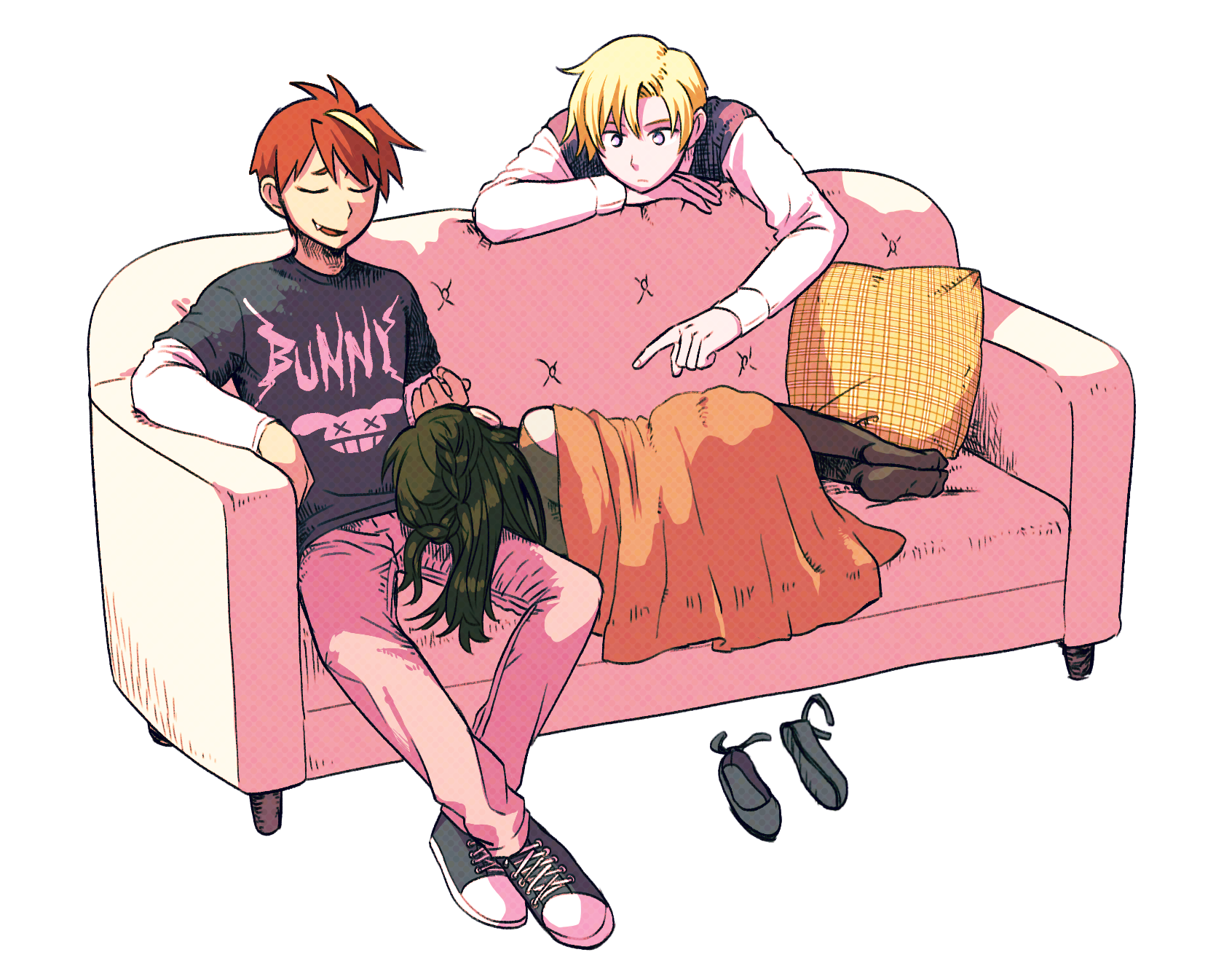 1girl 2boys amatsuka_yui asadoke_no_majo blanket blonde_hair blue_eyes blue_sweater_vest braid brown_hair charlotte_(asadoke_no_majo) couch highres layered_sleeves long_hair long_sleeves multicolored_hair multiple_boys necktie nogi_shuichi official_art poreisan_(portrain) red_hair sharp_teeth short_hair short_over_long_sleeves short_sleeves sleeping streaked_hair sweater_vest teeth thighhighs under_covers