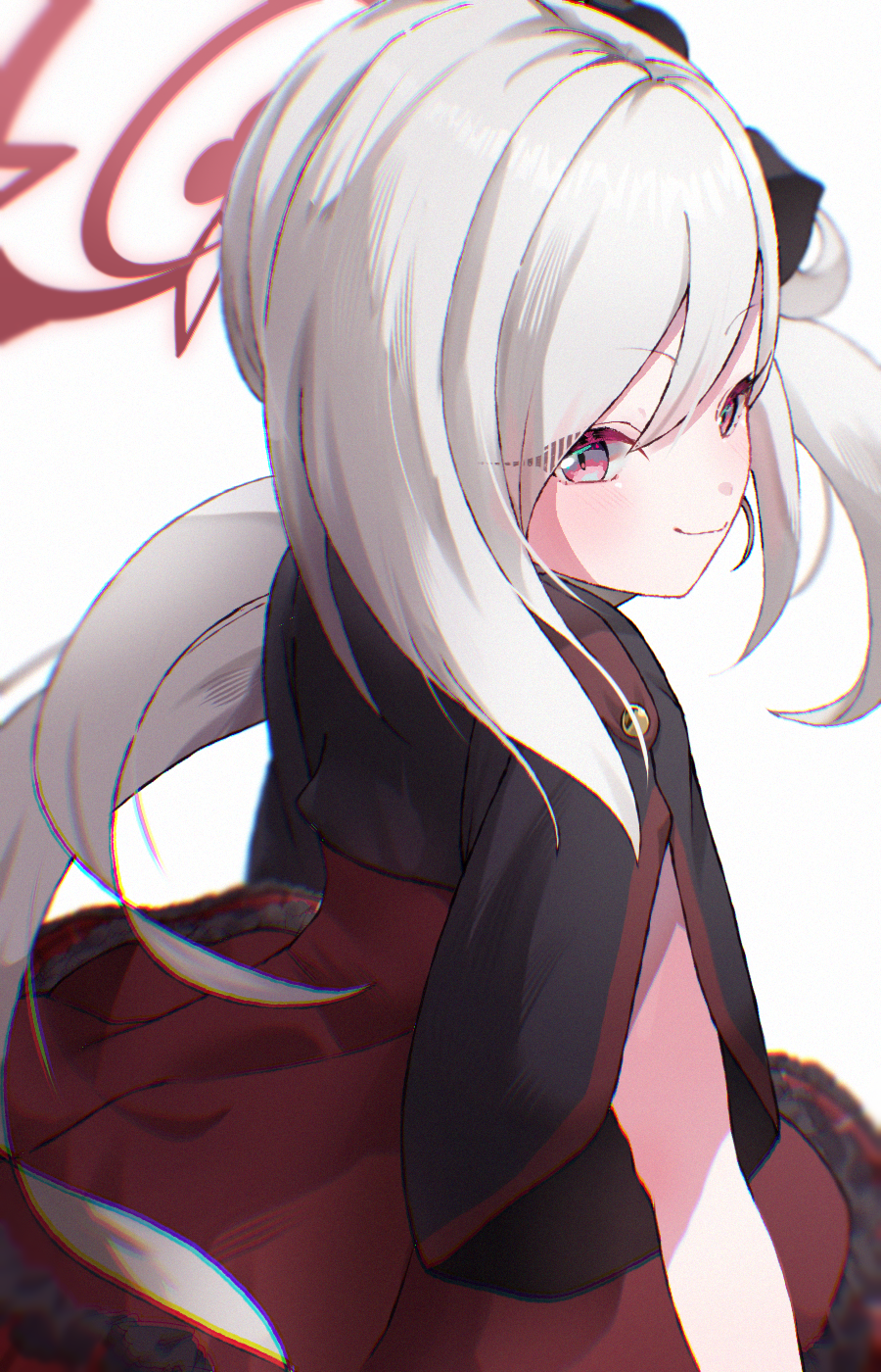 1girl blue_archive halo highres jacket mutsuki_(blue_archive) red_eyes rosyehosii side_ponytail simple_background skirt smile tagme white_background white_hair