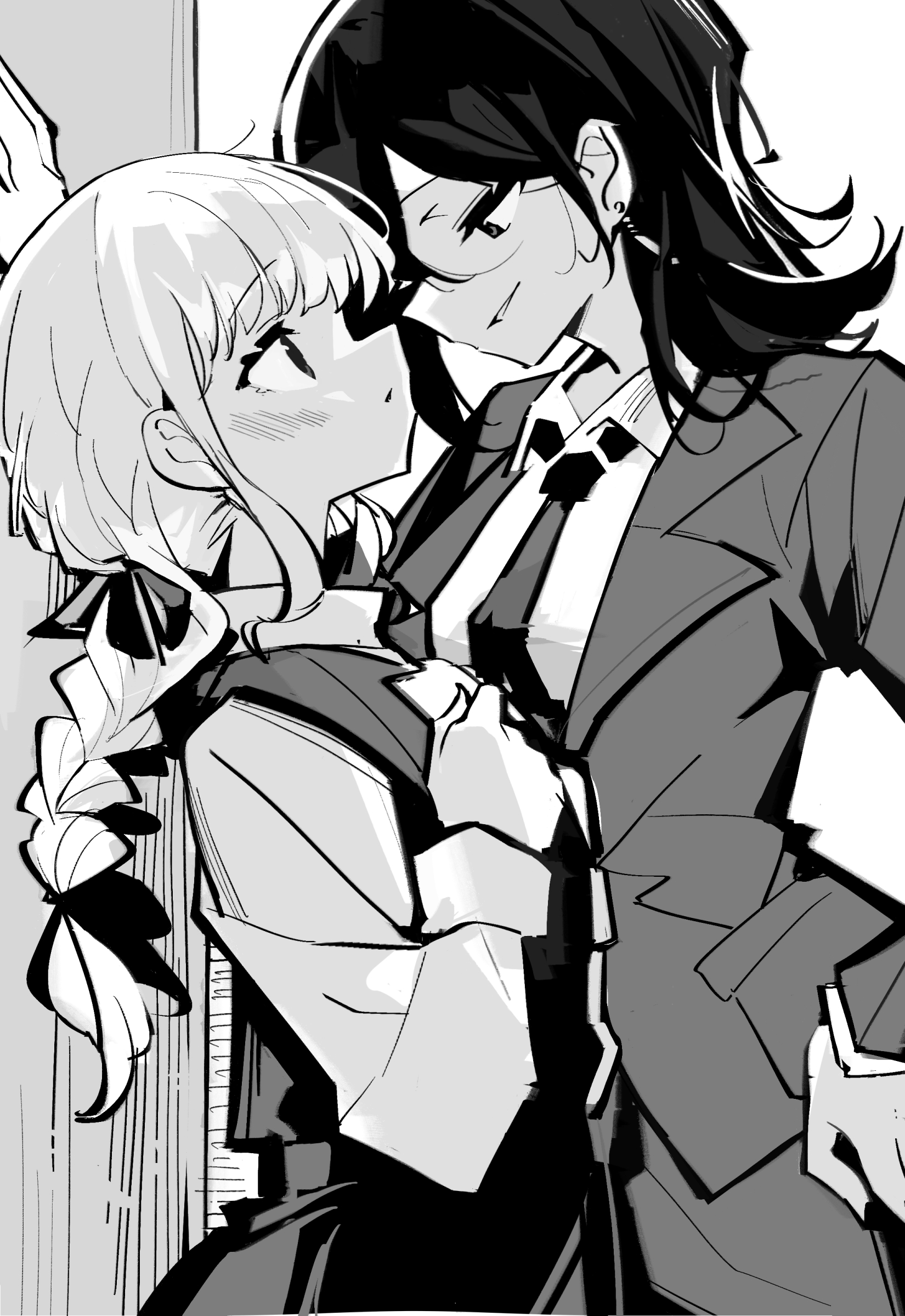 2girls absurdres black_hair black_jacket black_necktie braid earrings eye_contact formal_clothes fujita_kotone gakuen_idolmaster gakuen_idolmaster_gold_rush hair_ribbon highres idolmaster inuzuka_shizuku jacket jewelry kabedon long_hair long_sleeves looking_at_another monochrome multiple_girls necktie ribbon smile suit twin_braids upper_body yuri zhanzhangzlw