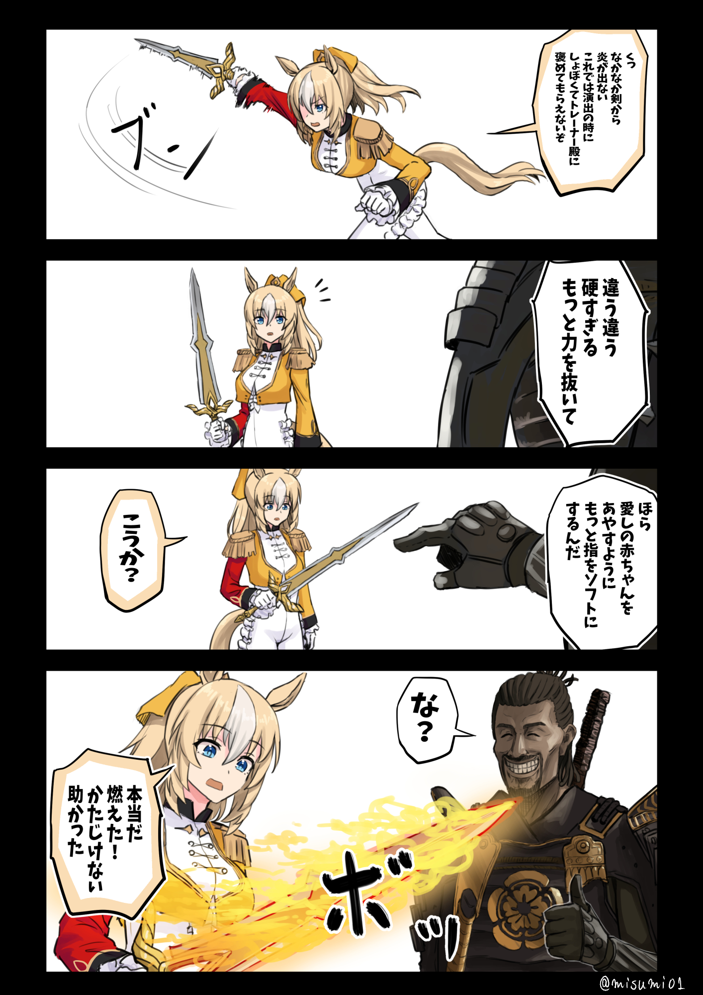 1boy 1girl animal_ears armor blonde_hair blue_eyes commentary_request crest durandal_(umamusume) epaulettes family_crest fire flaming_sword flaming_weapon highres holding holding_sword holding_weapon horse_ears horse_girl japanese_armor long_hair long_sleeves misumi_(niku-kyu) multicolored_hair sword thumbs_up translation_request twitter_username two-tone_hair umamusume weapon white_hair