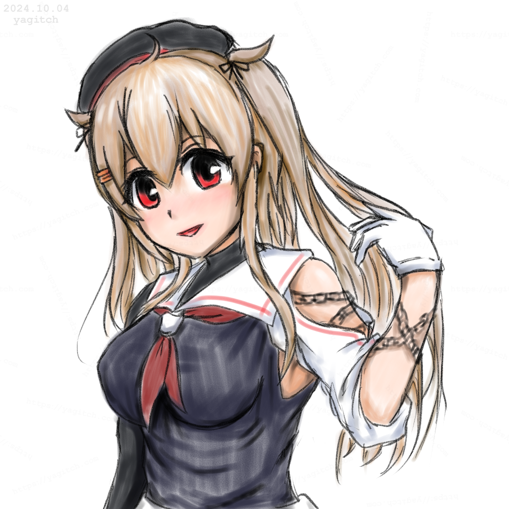 1girl artist_name asymmetrical_clothes beret black_bodysuit black_hat black_ribbon black_serafuku black_shirt blush bodysuit bodysuit_under_clothes chain dated detached_sleeves gloves hair_flaps hair_ornament hair_ribbon hairclip hat kantai_collection light_brown_hair long_hair murasame_(kancolle) murasame_kai_ni_(kancolle) neckerchief one-hour_drawing_challenge open_mouth red_eyes red_neckerchief ribbon sailor_collar school_uniform serafuku shirt smile solo two_side_up upper_body white_background white_gloves white_sailor_collar yagitch