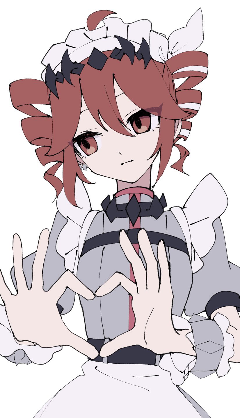 ahoge apron averting_eyes drill_hair earrings expressionless grey_shirt hair_between_eyes heart heart_hands highres jewelry kasane_teto long_hair long_sleeves maid maid_headdress multicolored_hair red_eyes red_hair shirt simple_background streaked_hair synthesizer_v trtmtrn twin_drills utau waist_apron white_apron white_background white_hair