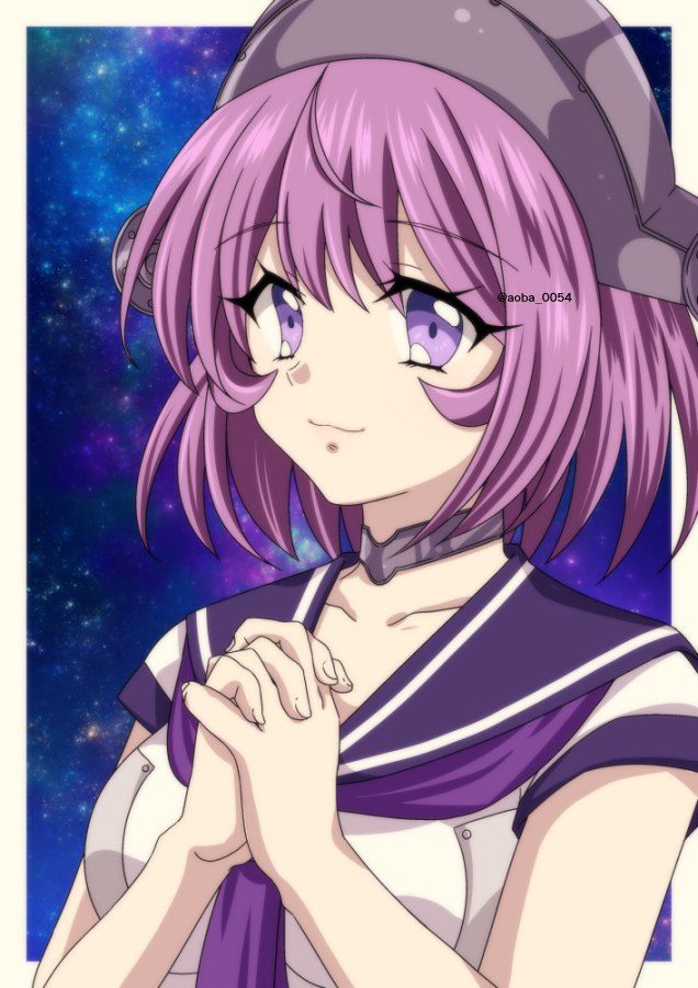 1girl :3 commentary_request dress headgear kantai_collection lexington_(kancolle) neckerchief night own_hands_clasped own_hands_together oyu_(aoba_0054) purple_eyes purple_hair purple_neckerchief purple_sailor_collar sailor_collar sailor_dress short_hair sky smile solo upper_body
