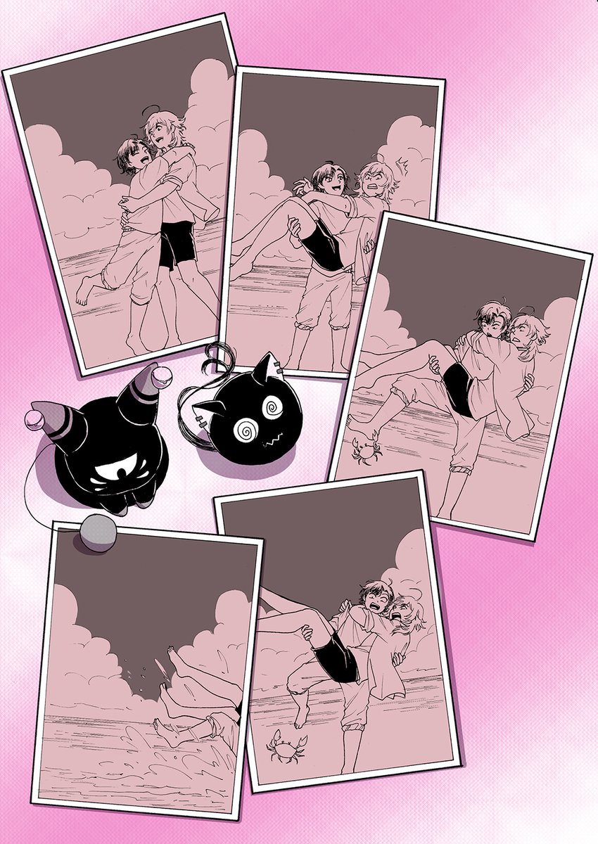2boys @_@ ahoge alternate_costume beach blush carrying commentary crab creature english_commentary falling gavis_bettel glaring hair_between_eyes highres holostars holostars_english hug looking_at_viewer machina_x_flayon machiroon_(machina_x_flayon) male_focus medium_hair monochrome multiple_boys ocean open_mouth phantom_(gavis_bettel) photo_(object) pink_background princess_carry round_tofu sepia shirt short_hair smile splashing standing virtual_youtuber yaoi
