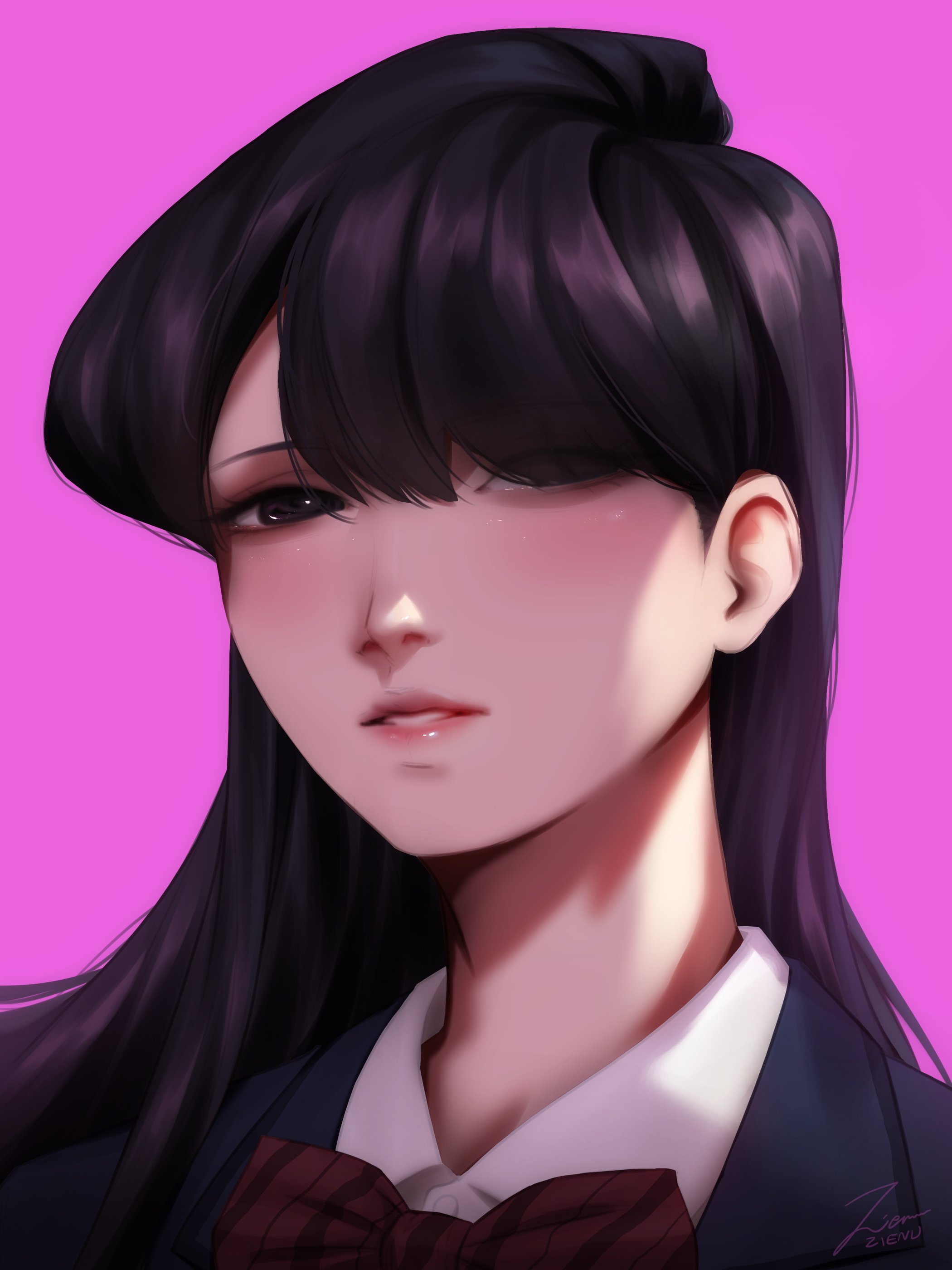 1girl absurdres black_eyes black_hair blazer blue_jacket bow diagonal-striped_bow highres itan_private_high_school_uniform jacket komi-san_wa_komyushou_desu komi_shouko long_hair looking_at_viewer parted_lips pink_background school_uniform shirt simple_background solo striped_bow white_shirt zienu
