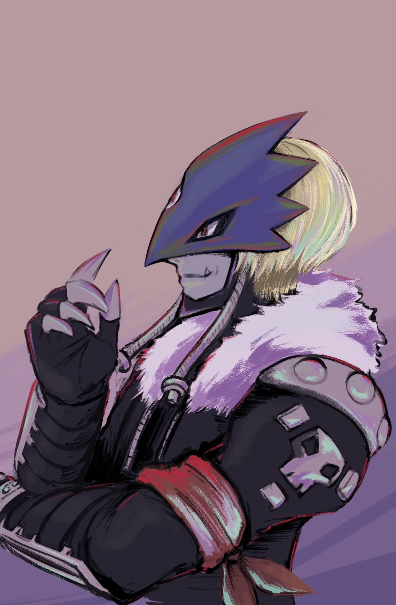 1boy alternate_hairstyle bandana_around_arm beelzebumon black_jacket blonde_hair colored_skin digimon digimon_(creature) fang from_side fur-trimmed_jacket fur_trim grey_skin highres jacket male_focus mas_square profile red_eyes short_hair solo third_eye upper_body