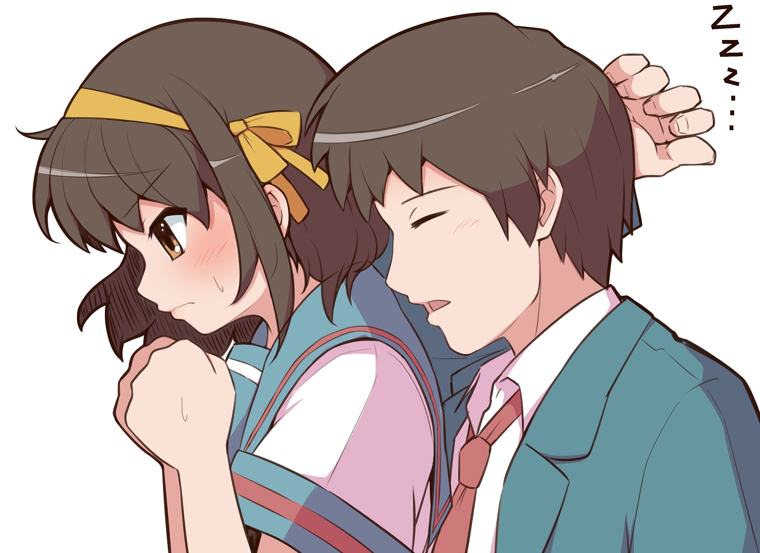 1boy 1girl arm_up blazer blush brown_hair closed_eyes closed_mouth collared_shirt commentary_request from_side green_jacket hair_ribbon hairband hands_up jacket kita_high_school_uniform kyon long_sleeves multiple_seasonal_school_uniforms necktie red_necktie ribbon school_uniform shiro_bouzu shirt short_hair short_sleeves simple_background summer_uniform suzumiya_haruhi suzumiya_haruhi_no_yuuutsu white_background white_shirt winter_uniform yellow_hairband yellow_ribbon zzz