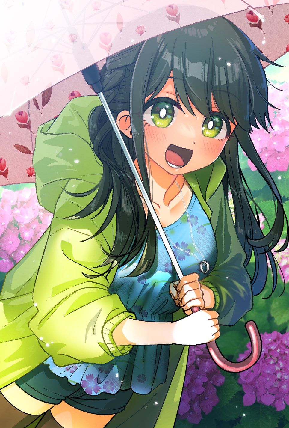 1girl alternate_hairstyle amatsuka_yui asadoke_no_majo braid brown_hair green_eyes green_jacket highres holding holding_umbrella jacket jewelry long_hair necklace official_art pink_umbrella ponytail poreisan_(portrain) shorts smile solo thighhighs umbrella