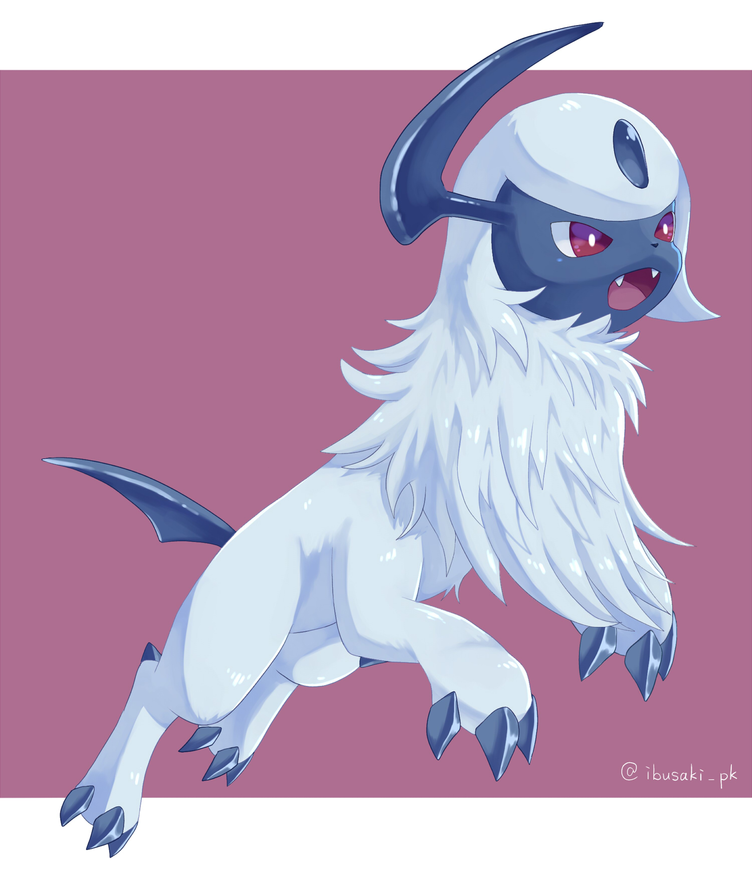 absol animal animal_focus claws fangs gen_3_pokemon highres horns ibusaki_(ivu) nintendo open_mouth pokemon pokemon_(creature) red_eyes single_horn solo white_hair