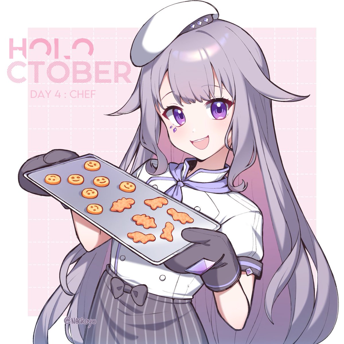 1girl alternate_costume apron baking_sheet beret border chef colored_inner_hair commentary cookie english_commentary face_jewel food grey_apron grey_hair hair_flaps hat highres holding hololive hololive_english jewel_under_eye koseki_bijou light_blush long_hair looking_at_viewer multicolored_hair nackoyo open_mouth outside_border oven_mitts pink_hair purple_eyes shirt short_sleeves smile solo striped_apron striped_clothes teeth tongue twitter_username two-tone_hair upper_body upper_teeth_only vertical-striped_apron vertical-striped_clothes very_long_hair virtual_youtuber waist_apron white_border white_hat white_shirt